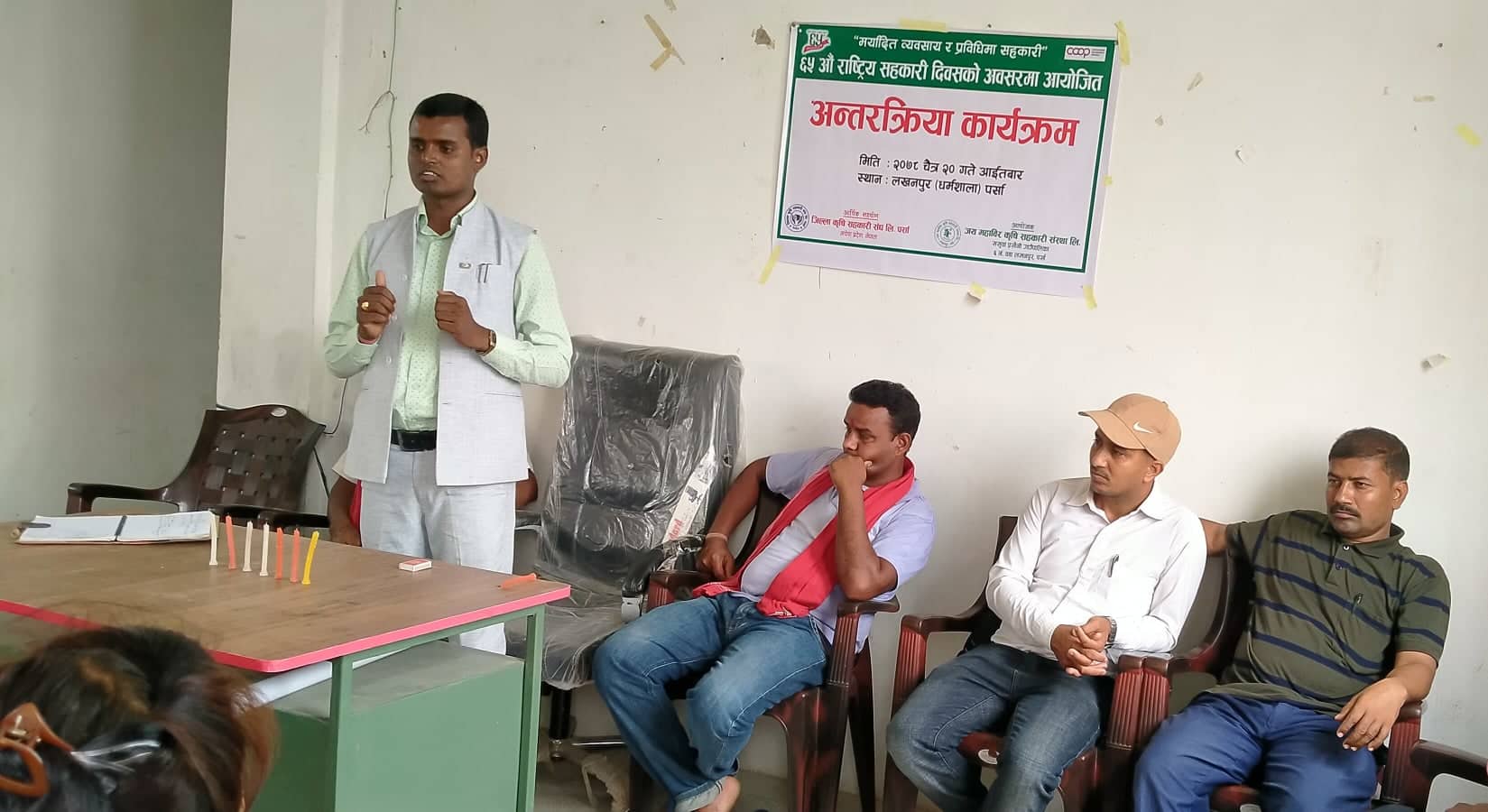 वीरगंज । “मर्यादित ब्यवसाय र प्रबिधिमा सहकारी” नाराको साथमा ६५ औ राष्ट्रिय सहकारी दिवसको अवसरमा जय महाबिर कृषि सहकारी संस्था लि. लखनपुरको आयोजना एवं जिल्ला कृषि सहकारी संघ लि. पर्साको आर्थिक सहयोगमा अन्तरक्रिया कार्यक्रम सम्पन्न भएको छ ।