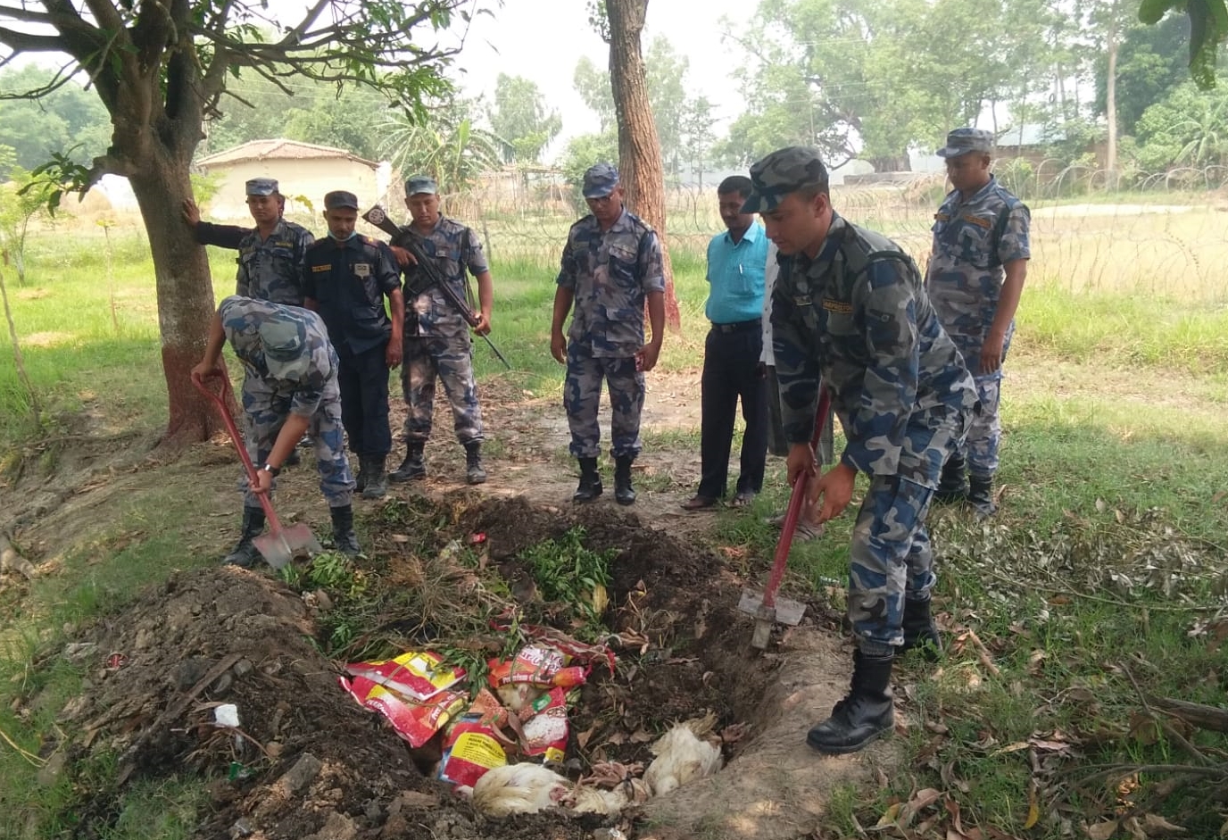 पहका मैनपुर गाउँपालिकाकाे वडा नं. ५ लक्ष्मिपुरबाट बरामद गरिएकाे रु ३० हजार मुल्य पर्ने कुखुरा सिमा प्रहरी चाैकी खेस्राहाका प्रनितिधि र स्थानिय पत्रकारकाे उपस्थितीमा नष्ट गरिएकाे प्रहरी नायब निरिक्षक सापकाेटाले जानकारी दिए ।