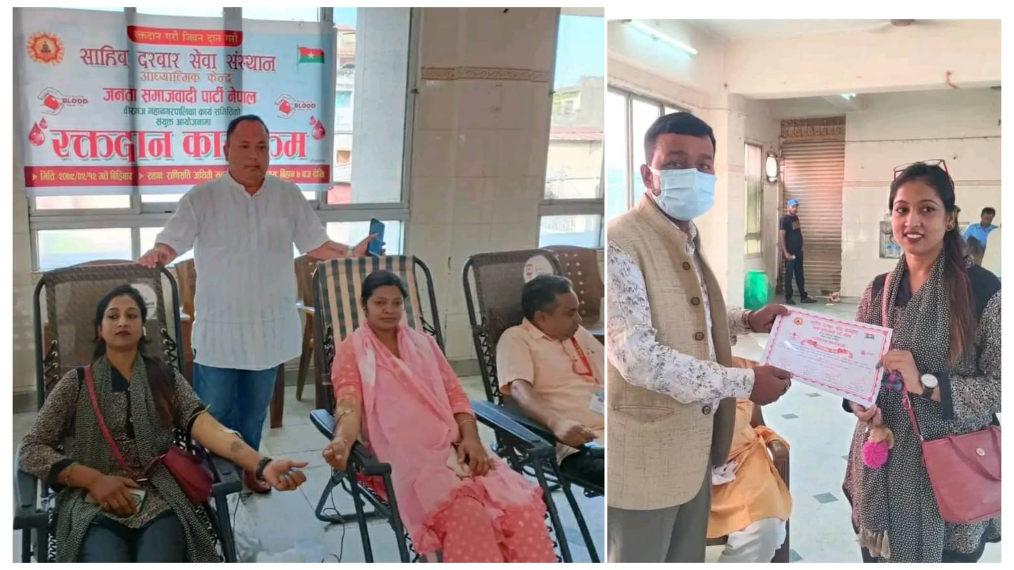साहिब दरबार सेवा सस्थानका महासचिव उमेशलाल सहनी र जसपाका वीरगंज महानगर अध्यक्ष ईश्वरचन्द यादवको संयुक्त अध्यक्षतामा र पर्सा क्षेत्र न.१ का संघिय सांसद प्रदिप यादबको प्रमुख आतिथ्यमा रक्तदान भएकाे कार्यक्रममा वीरगंज महानगरपालिका मेयर राजेशमान सिंह, प्रदेश सांसद करिमा बेगम, जसपाका जिल्ला अध्यक्ष रामनरेश यादव, सचिब तबरेज अहमद, सलाउदिन अहमद , रेखा साह, सस्थानका कोषाध्यक्ष जिनुमैया तोयाङ्गना, अफरोज आलम लगयतकाको सहभागीता रहेको थियो ।