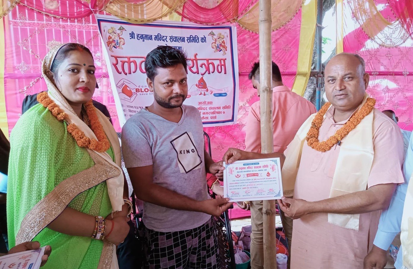 वीरगंज । पर्साको बहुदरमाई नगरपालिका वड़ा नं. ७ छपकैयामा साेमबार रक्तदान कार्यक्रम सम्पन्न भएको छ । श्री हनुमान मन्दिर संचालन समितिको आयोजनामा भएकाे कार्यक्रममा ७ महिलासहित ५३ जनाले रक्तदान गरेकाे रक्त संचार केन्द्र वीरगंजका प्रमुख सराैभ राज पाण्डेले जानकारी दिए ।