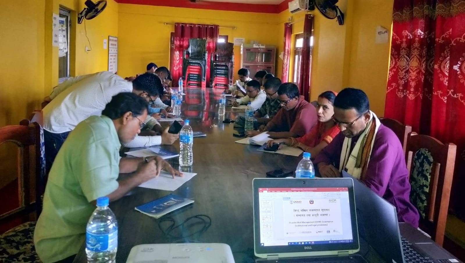 आईओएम र युएसएआईडि एकसनएडको सहयोगमा सुरु भएको तालिममा सहभागी जनप्रतिनिधिलाई प्रकृतिक विपद आउनु अघि जोखिम न्युनिकरण गर्न कसरी तयार रहने बिषयमा प्रशिक्षक सोनाली सिँह पटेल र छबिरमन भटराईले प्रशिक्षण दिइरहेका छन् ।