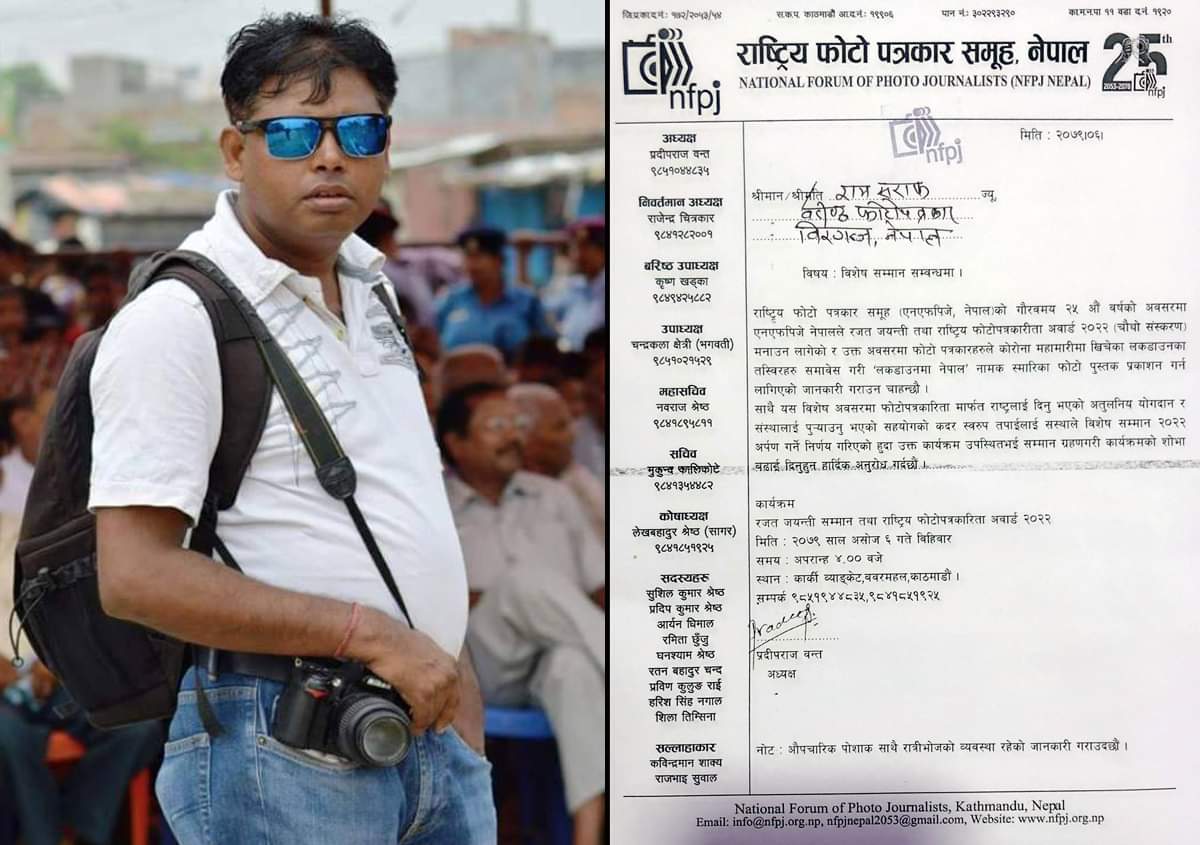 राष्ट्रिय फोटो पत्रकार समूह (एनएफपिजे, नेपाल) ले २५ औँ वर्ष पूरा गरेको अवसरमा आयोजना काठमाण्डौमा यही असोज ६ गते आयोजना गर्ने रजत जयन्ती तथा राष्ट्रिय फोटो पत्रकारिता अवार्ड २०२२ को चौथो संस्करणमा उनी सम्मानित हुने भएका हुन् ।