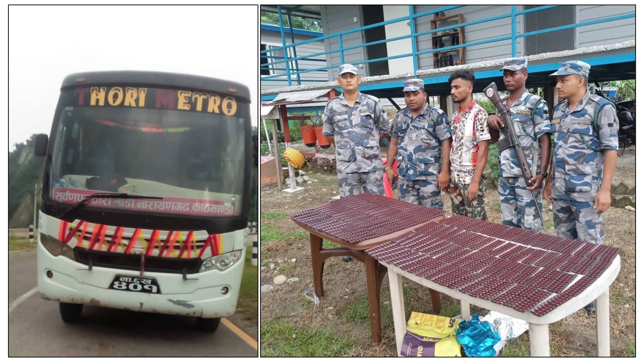 आइतबार सांझ ५:३० बजेको समयमा ठोरी गाउँपालिकाकाे वडा नं. २ स्थित रहेको वि.ओ. पि. ठोरीको मुलगेट अगाडि बसलाई चेकजाँच गर्ने क्रममा बसको क्याबिनमा रहेको चालक सिट मुनी झोलामा लुकाई छिपाई राखेको अवस्थामा प्रतिबन्धित लागु औषध बरामद भएकाे सशस्त्र प्रहरी बल, नेपाल नं. १३ गण पर्साले जनाएकाे छ ।