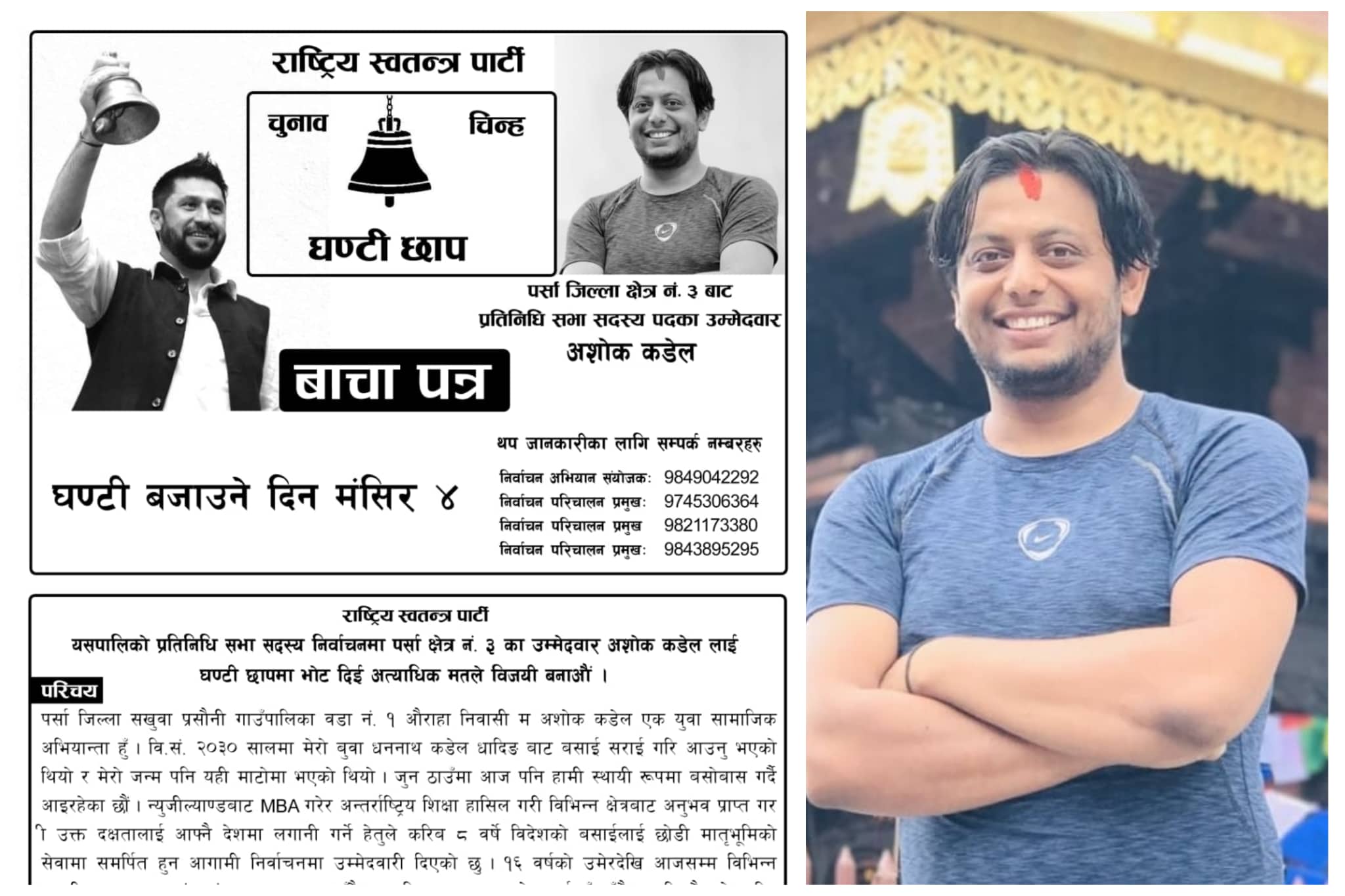 वीरगंज । राष्ट्रिय स्वतन्त्र पार्टीका पर्सा निर्वाचन क्षेत्र नं. ३ का प्रतिनिधिसभा सदस्यका उम्मेदवार अशाेक कडेलले २० बुंदे बाचा पत्र सार्वजनिक गरेका छन् । उम्मेदवार कडेलले बिहिबार एक कार्यक्रमका बिच पार्टीकाे तर्फबाट बाचा पत्र सार्वजनिक गर्दै चुनाव चिन्ह घण्टी छापमा मतदान गरी विजयी बनाउन आग्रह गरेका हुन् ।