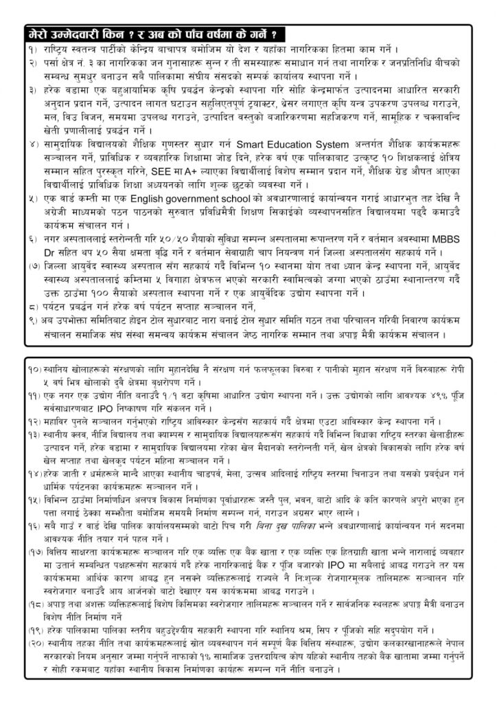 राष्ट्रिय स्वतन्त्र पार्टीको केन्द्रिय वाचापत्र बमोजिम यो देश र यहाँका नागरिकका हितमा काम गर्ने, पर्सा क्षेत्र नं. ३ का नागरिकका जन गुनासाहरू सुन्न र ती समस्याहरू समाधान गर्न तथा नागरिक र जनप्रतिनिधि बीचको सम्बन्ध सुमधुर बनाउन सबै पालिकामा संघीय संसदको सम्पर्क कार्यालय स्थापना गर्ने, हरेक वडामा एक बहुआयामिक कृषि प्रबर्द्धन केन्द्रको स्थापना गरि सोहि केन्द्रमार्फत उत्पादनमा आधारित सरकारी अनुदान प्रदान गर्ने, उत्पादन लागत घटाउन सहुलिएतपूर्ण ट्याक्टर, थ्रेसर लगाएत कृषि यन्त्र उपकरण उपलब्ध गराउने, मल, विउ विजन, समयमा उपलब्ध गराउने, उत्पादित वस्तुको बजारिकरणमा सहजिकरण गर्ने, सामूहिक र चक्लावन्दि खेती प्रणालीलाई प्रवर्द्धन गर्ने उनले जारी गरेकाे बाचा पत्रमा उल्लेख छ ।