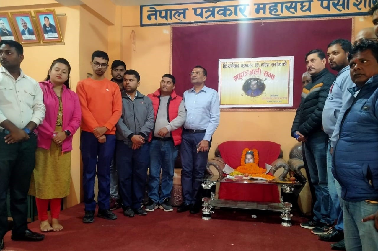 वीरगंज । क्रियाशील युवा पत्रकार मंच पर्साकाे आयाेजनामा वीरगंजका पत्रकार स्वर्गीय नरेश सरार्फको श्रद्धान्जली सभा बिहिबार सम्पन्न भएकाे छ । हृदयघातबाट अल्पायुमै निधन भएका पत्रकार सर्राफकाे याेगदानलाई कहिले पनि बिर्सिन नसकिने वक्ताहरुले वताएका छन् ।