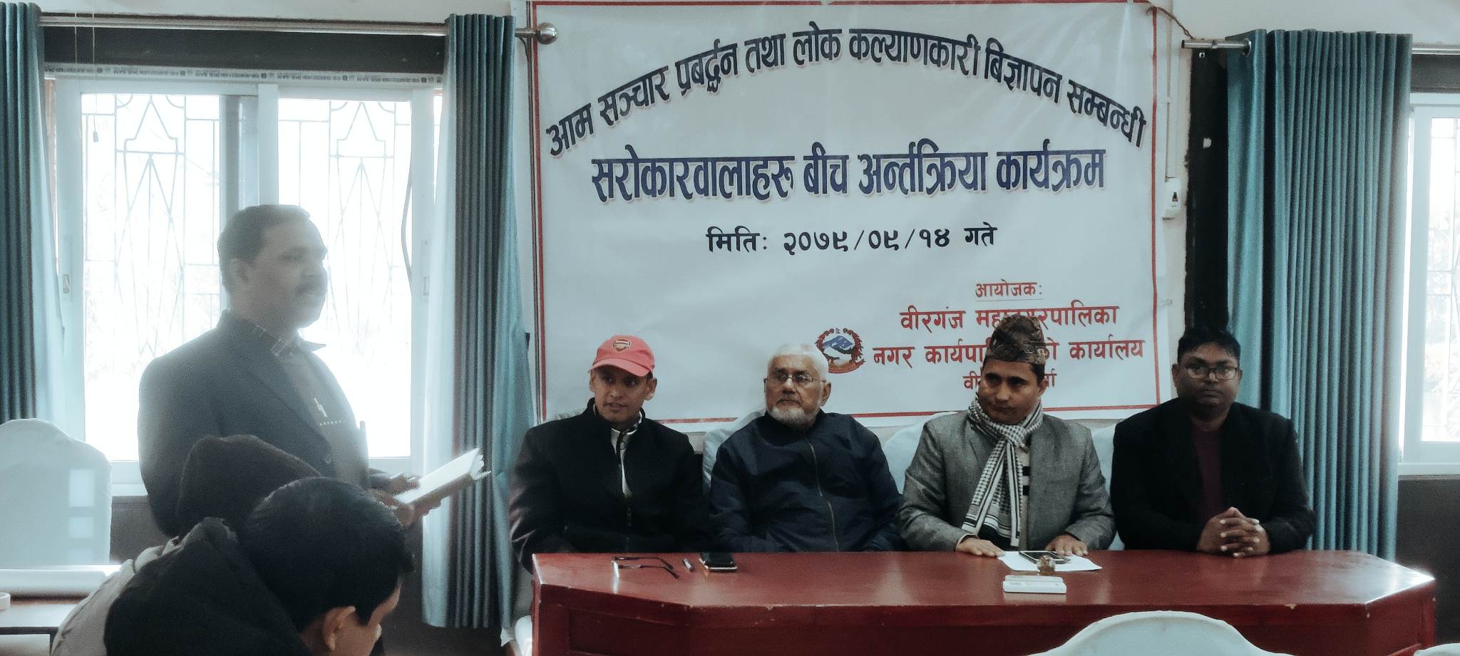 वीरगंज । वीरगंज महानगरपालिकाको आम सञ्चार माध्यम नियमन तथा प्रबर्द्धन समितिले स्थानीय पत्रपत्रिकालाई संरक्षण र प्रबर्धन गर्ने उद्देश्यले बिहीबार अन्तरक्रिया कार्यक्रम गरेको छ । महानगरपालिकाले दिँदै आएको लोक कल्याणकारी विज्ञापन र सूचनालाई व्यवस्थित र पारदर्शी ढंगले समानुपातिक रुपमा वितरण गर्ने उद्देश्यले पत्रिकाहरुको समस्या र महानगरपालिकाले गर्न सक्ने समाधानको विषयमा छलफल भएको हो ।