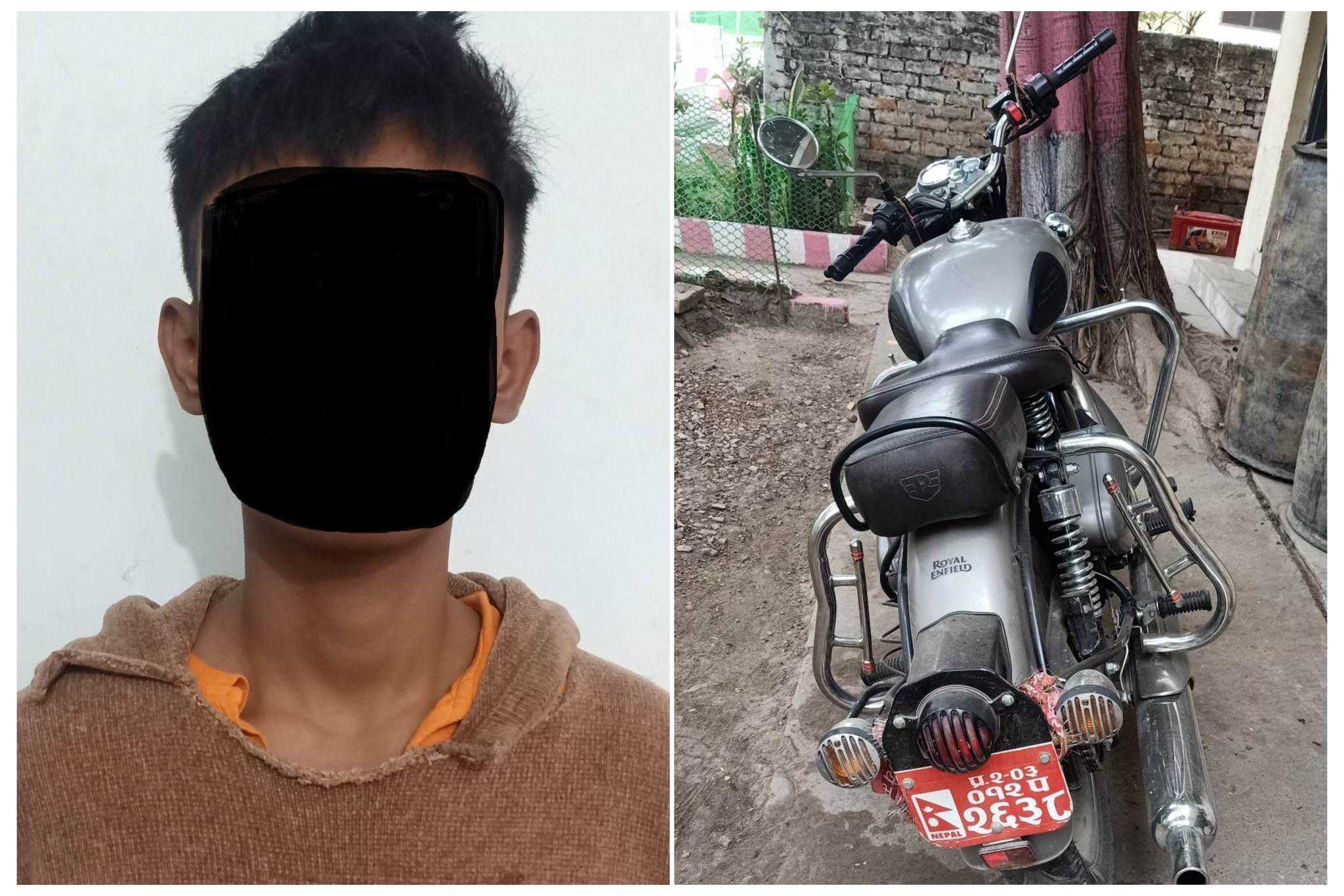 रौतहट जिल्लाको वृन्दावन नगरपालिका वडा नम्बर १ घर भई हाल वीरगंज महानगरपालिका वडा नम्बर १२ बस्ने ३६ वर्षीय अजय कुमार यादवको नाममा दर्ता रहेको प्र.२–०३–०१२ प २६३८ नम्बरको खैरो रंगको ३ सय ५० सिसीको बुलेट मोटरसाइकल चोर्दै गरेको अवस्थामा पक्राउ गरिएको प्रनाउ परीक्षक गिरीले जानकारी दिए ।