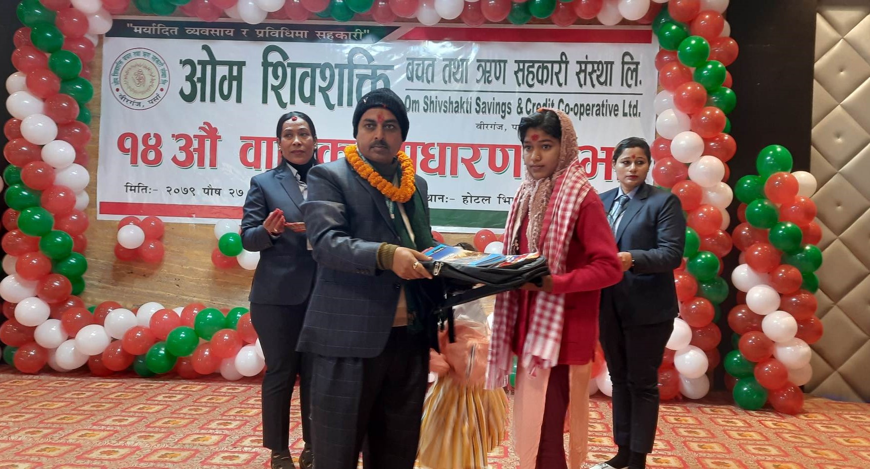 सो अवसरमा संस्थाले गरिब, असहाय जेहन्दार विद्यार्थी सन्ध्या कुमारी सोनार र सन्ध्या कुमारी रौनियारलाई कपि, पेन, व्याग तथा कक्षा १० सम्म छात्रवृति समेत दिईएको थियो । सोही अवसरमा विगत लामो समय देखि श्री ओमशिवशक्ति वचत तथा ऋण सहकारी संस्था लिमिटेडमा रही उत्कृष्ट कार्य गरेका बबिता कुमारी उदास र मनिषा गोलेलाई दोसल्ला र प्रमाणपत्र दिई सम्मान गरिएको थियो ।