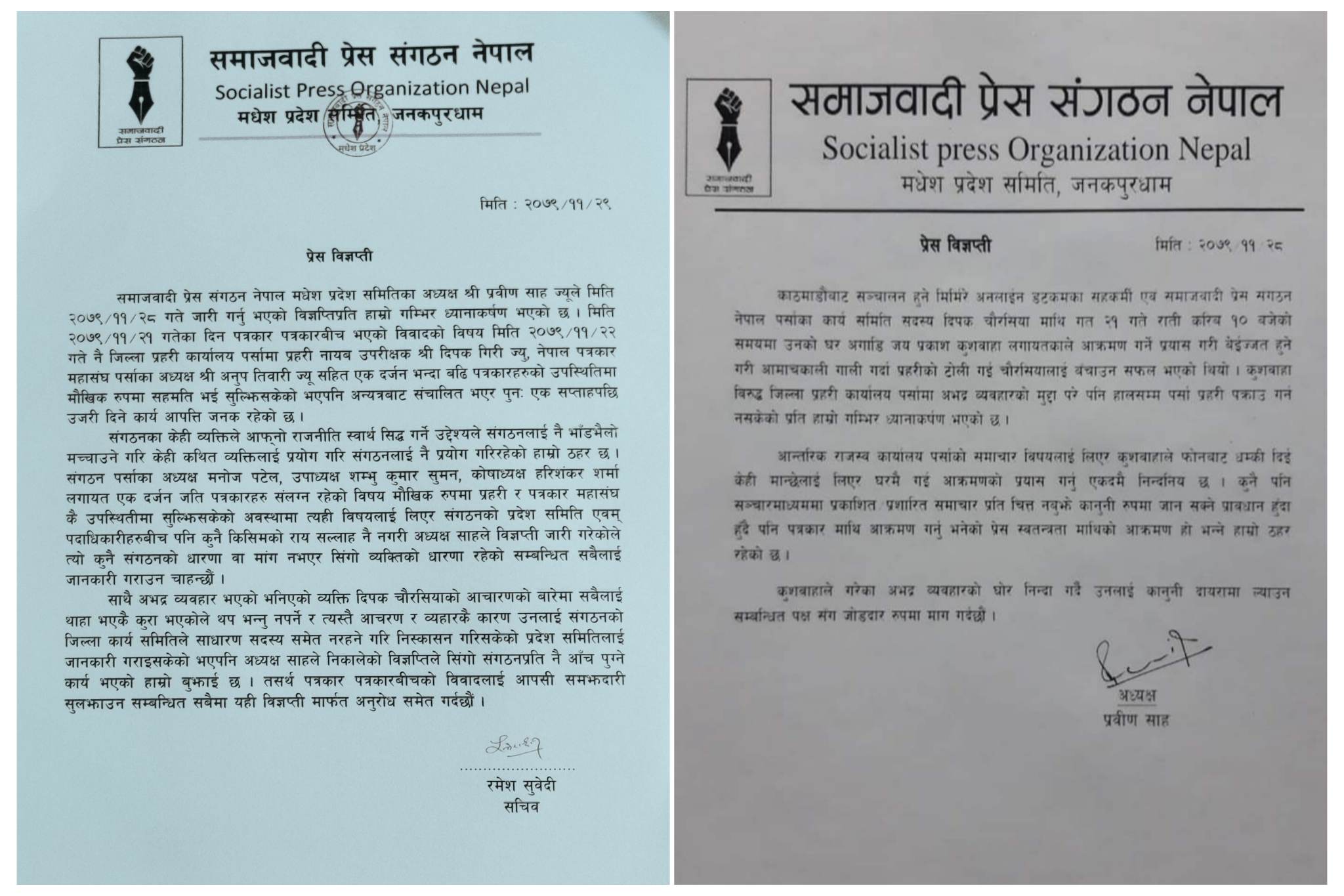 प्रदेश समितिका सचिव सुवेदीद्वारा हस्ताक्षरित विज्ञप्तिमा मिति २०७९/११/२१ गतेका दिन पत्रकार पत्रकारबीच भएको विवादको विषय जिल्ला प्रहरी कार्यालय पर्सामा प्रहरी नायब उपरीक्षक दिपक गिरी, नेपाल पत्रकार महासंघ पर्साका अध्यक्ष अनुप तिवारी सहित एक दर्जन भन्दा बढि पत्रकारहरुको उपस्थितिमा मौखिक रुपमा सहमति भई विवाद सुल्झिसकेको अवस्थामा अन्यत्रबाट संचालित भएर पुनः एक सप्ताहपछि उजरी दिने कार्य गरेको र त्यसको समर्थमा संगठनका प्रदेश समितिका अध्यक्ष प्रवीण साहले हचुवाको भरमा कसैसँग सल्लाह नै नगरी संगठनबाट निष्काशन गरि सकिएको व्यक्तिको संरक्षणको लागि विज्ञप्ति जारी गरेकोप्रति संगठनकाे आपत्ति रहेकाे उल्लेख गरिएको छ ।