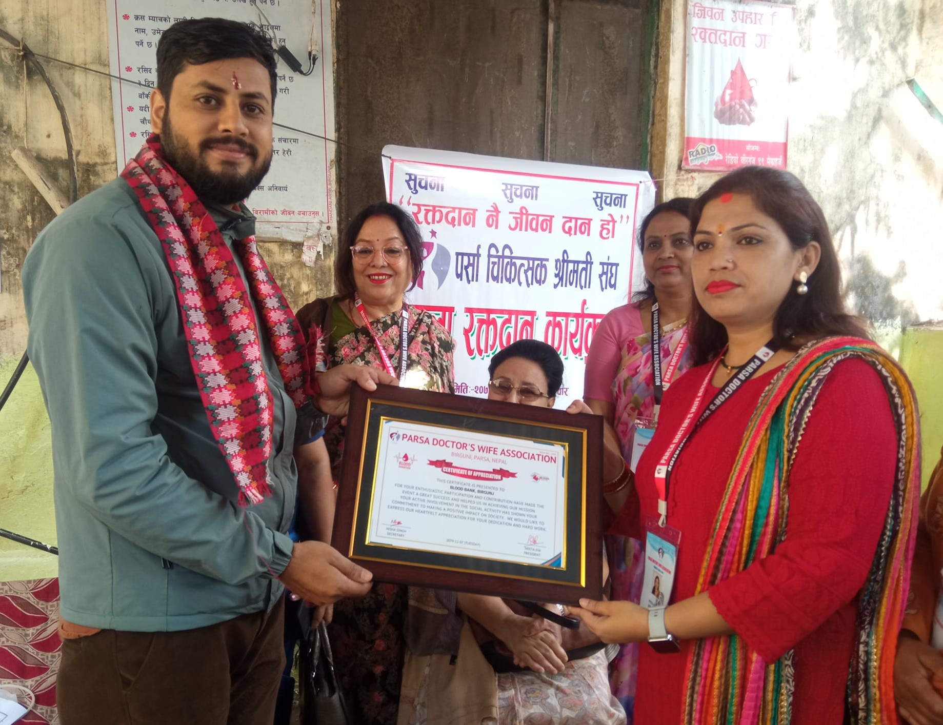 रक्तदान कार्यक्रम मै चिकित्सक श्रीमति संघ पर्साले रक्त सञ्चार केन्द्र वीरगंजका प्राविधिक प्रमुख सौरभराज पाण्डेलाई सम्मानित समेत गरेको थियो ।