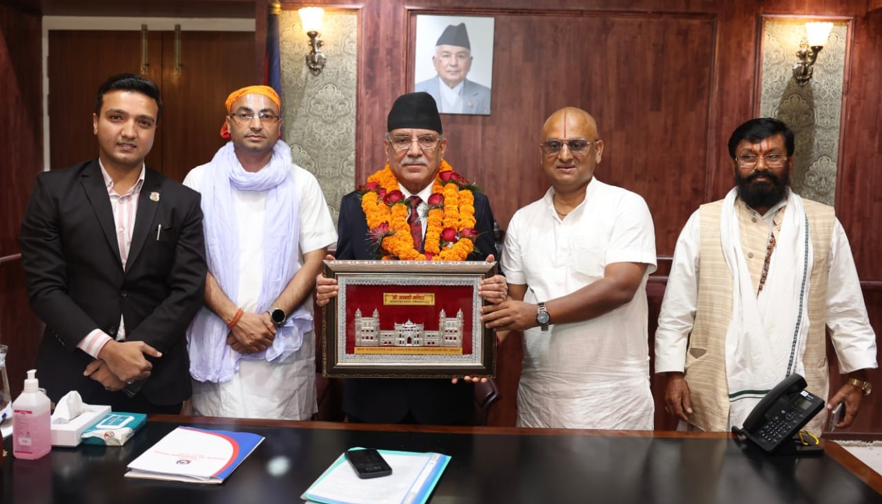 वीरगंज । जनकपुरधामकाे जानकी मन्दिरका महन्तहरुकाे एक टाेलीले प्रधानमन्त्री पुष्पकमल दाहाल (प्रचण्ड) संग भेटघाट गरेका छन् । प्रधानमन्त्री प्रचण्ड कै कार्यकक्ष मै पुगि जानकी मन्दिरका उत्तराधिकारी महन्त रामरोशन दास लगायत विभिन्न मन्दिरका पुजारी सन्तहरु भेटघाट गरेका हुन् ।