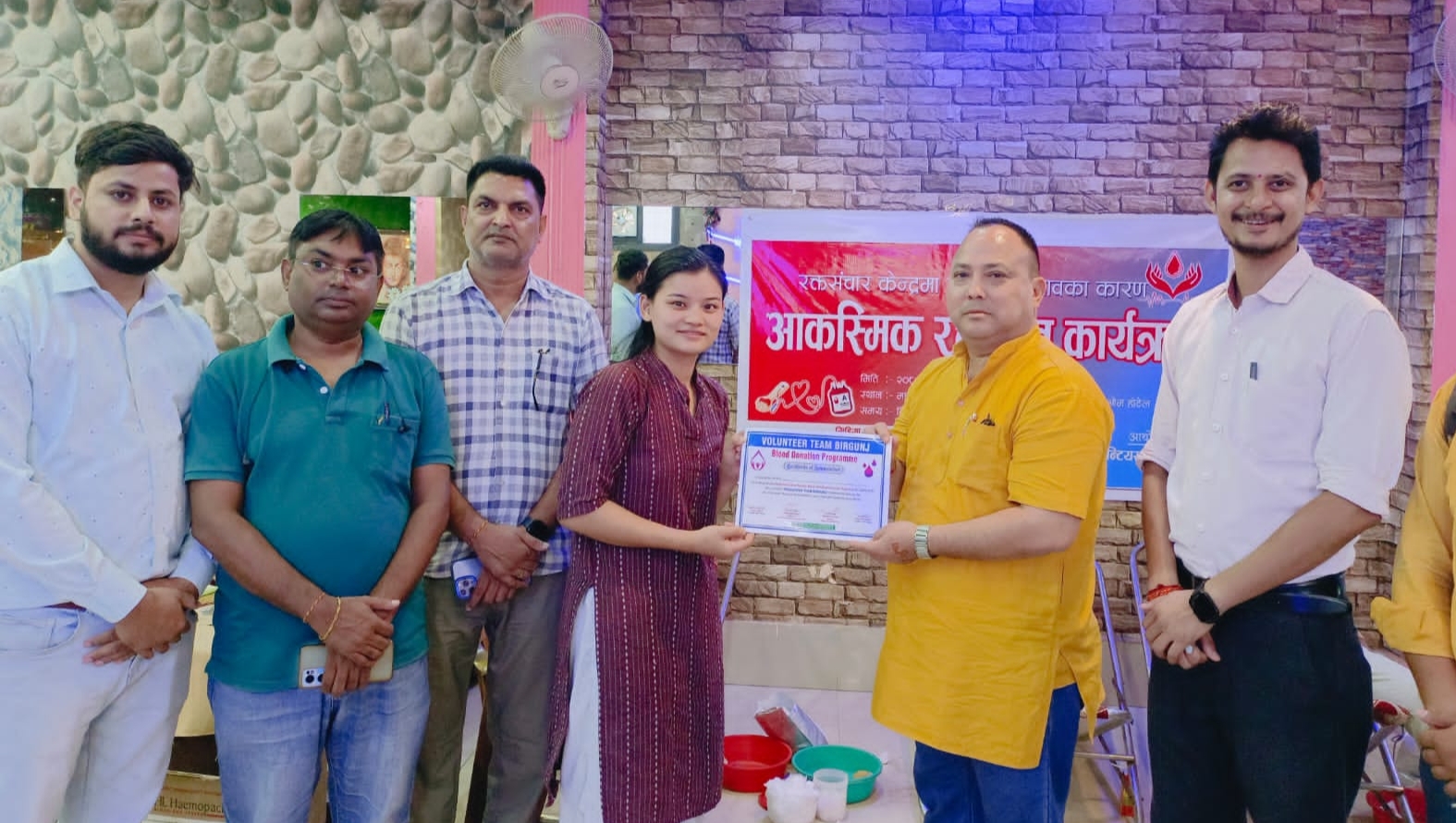 रक्तदान कार्यक्रम सञ्चालन गर्न रक्तसञ्चार केन्द्र वीरगञ्जका प्रमुख सौरभ राज पाण्डेसहितको टोलीले प्राविधिक सहयोग गरेको थियो ।