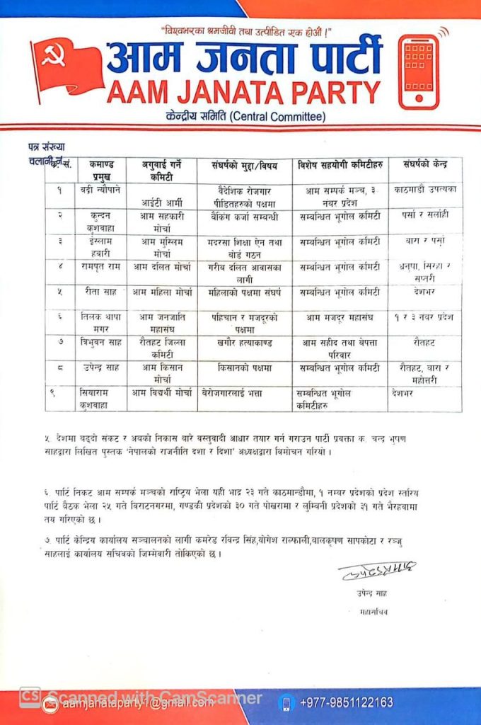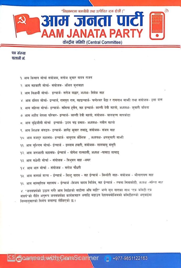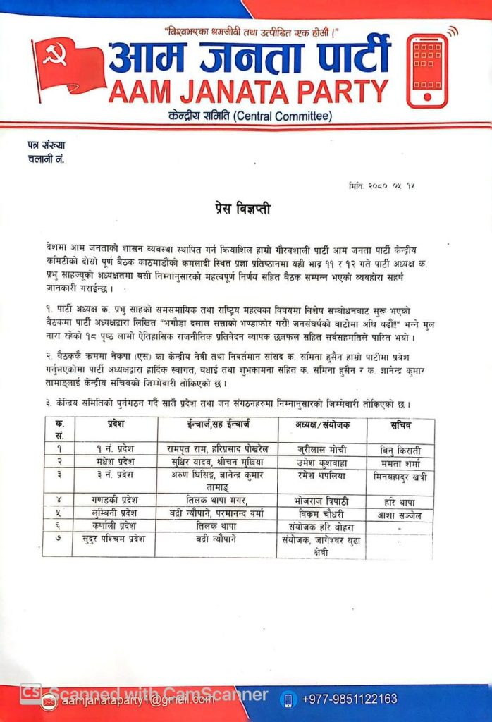 यसैगरी बैठकले केन्द्रिय समितिकाे पुर्नगठन गर्दै सातै प्रदेश तथा जनसंगठनहरुकाे जिम्मेवारी समेत ताेकेकाे महासचिव उपेन्द्र साहद्वारा जारि विज्ञप्तीमा उल्लेख गरिएकाे छ ।