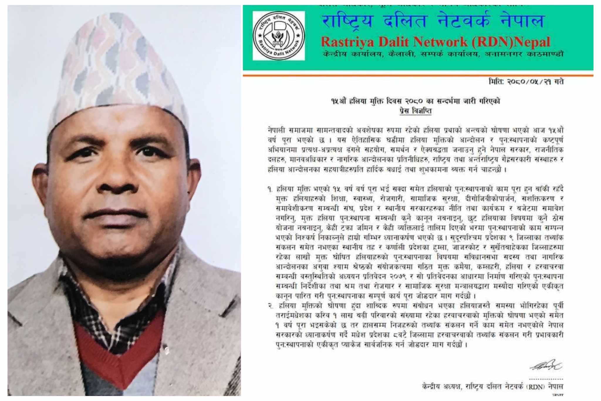 सुदूरपश्चिम प्रदेशका ९ जिल्लाका तथ्याँक संकलन समेत नभएका स्थानीय तह र कर्णाली प्रदेशका हुम्ला, जाजरकोट र सुर्खेतबाहेकका जिल्लाहरुमा रहेका लाखौं मुक्त घोषित हलियाहरुको पुनःस्थापनाका विषयमा संविधान सभा सदस्य तथा नागरिक आन्दोलनका अगुवा श्याम श्रेष्ठको संयोजकत्वमा गठित मुक्त कमैया, कम्लहरी, हलिया र हरवाचरवा सम्वन्धी वस्तुस्थितिको अध्ययन प्रतिवेदन २०७९ र सो प्रतिवेदनका आधारमा निर्माण गरिएको पुनरस्थापना सम्बन्धी निर्देशीका तथा श्रम तथा रोजगार र सामाजिक सुरक्षा मन्त्रालयद्वारा मस्यौदा गरिएको एकीकृत कानून पारित गरी पुनःस्थापनाका सम्पूर्ण कार्य पूरा गर्न विज्ञप्ती मार्फत जोडदार माग समेत गरिएकाे छ ।
