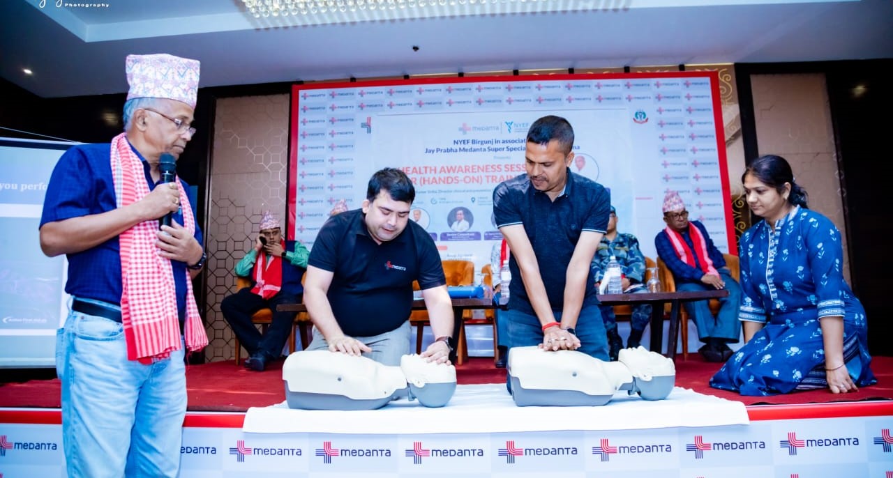 अस्पतालसँगको सहकार्यमा नेपाल युवा उद्यमी मञ्च (एनवाइईएफ) वीरगंजले शनिवार यहाँस्थित दियालो लर्ड्स प्लाजा होटेलमा आयोजना गरेको कार्यक्रममा विभिन्न सङ्घ संस्थाबाट आमन्त्रित प्रतिनिधिलाई डा. सिन्हा र उनीसँगै आएको विशेषज्ञ चिकित्सकहरूको समूहले सिपीआर सम्बन्धी सैद्धान्तिक जानकारी गराउनुका साथै डम्मीको सहयोगले सीपीआर गर्ने तरिकाका बारेमा प्रशिक्षण गरेका थिए ।