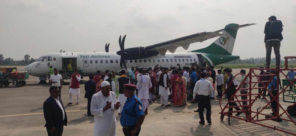 नेकपा एमालेका अध्यक्ष केपी शर्मा ओलीको स्वागतमा एमाले कार्यकर्ताहरु धावनमार्गमै पुगेका थिए । यति एयर चढेर जनकपुरधाम पुगेका ओलीलाई स्वागत गर्न उनीहरु विमानको ढोकासम्मै पुगेका थिए ।