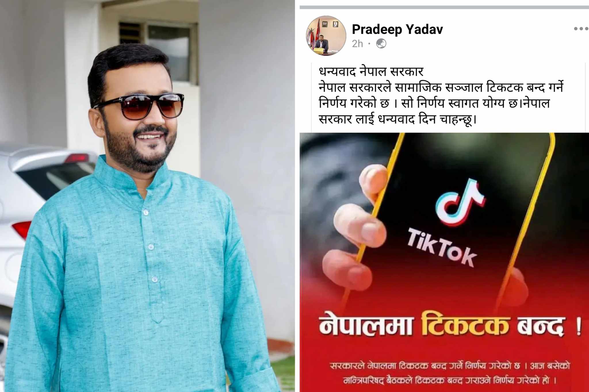सामाजिक सञ्जाल फेसबुकमा यादवले लेखेका छन्,‘धन्यवाद नेपाल सरकार । नेपाल सरकारले सामाजिक सञ्जाल टिकटक बन्द गर्ने निर्णय गरेको छ । सो निर्णय स्वागत योग्य छ । नेपाल सरकारलाई धन्यवाद दिन चाहन्छू।’