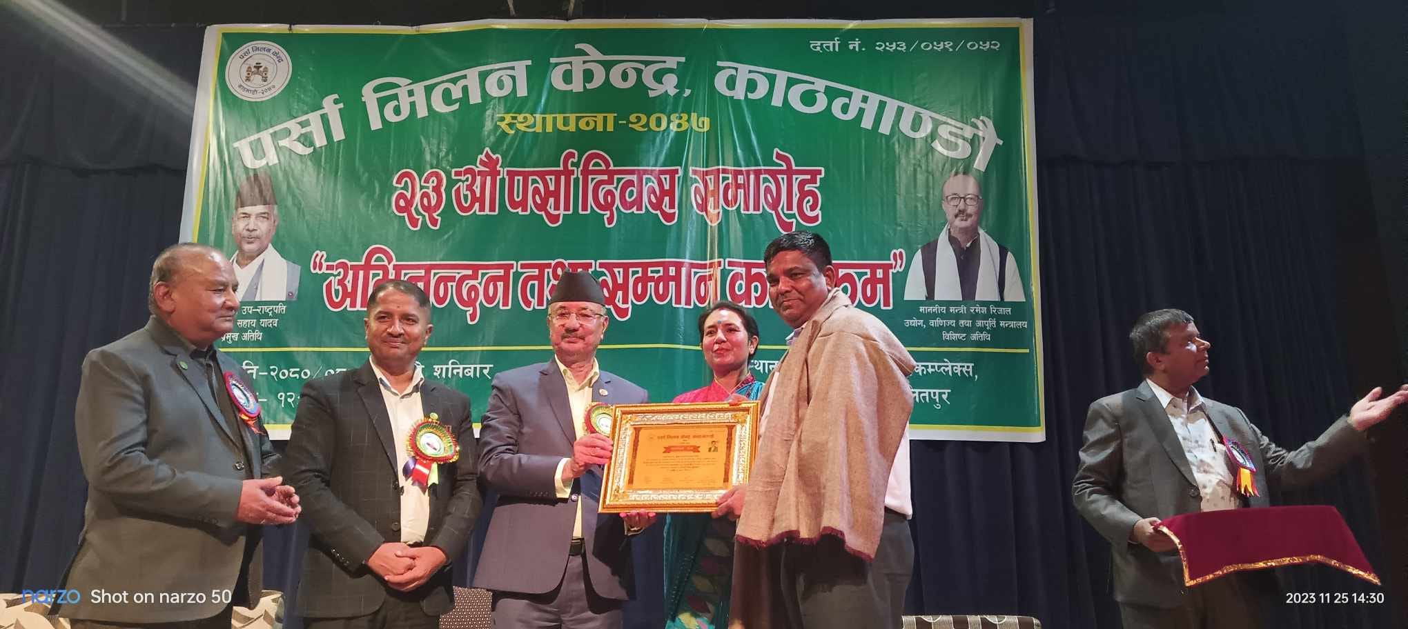 काठमाडौं । पर्सा मिलन केन्द्र काठमाडौँले आफ्नो २३ औँ स्थापना दिवस अवसरमा पत्रकार ध्रुव साहलाई सम्मान गरेको छ ।