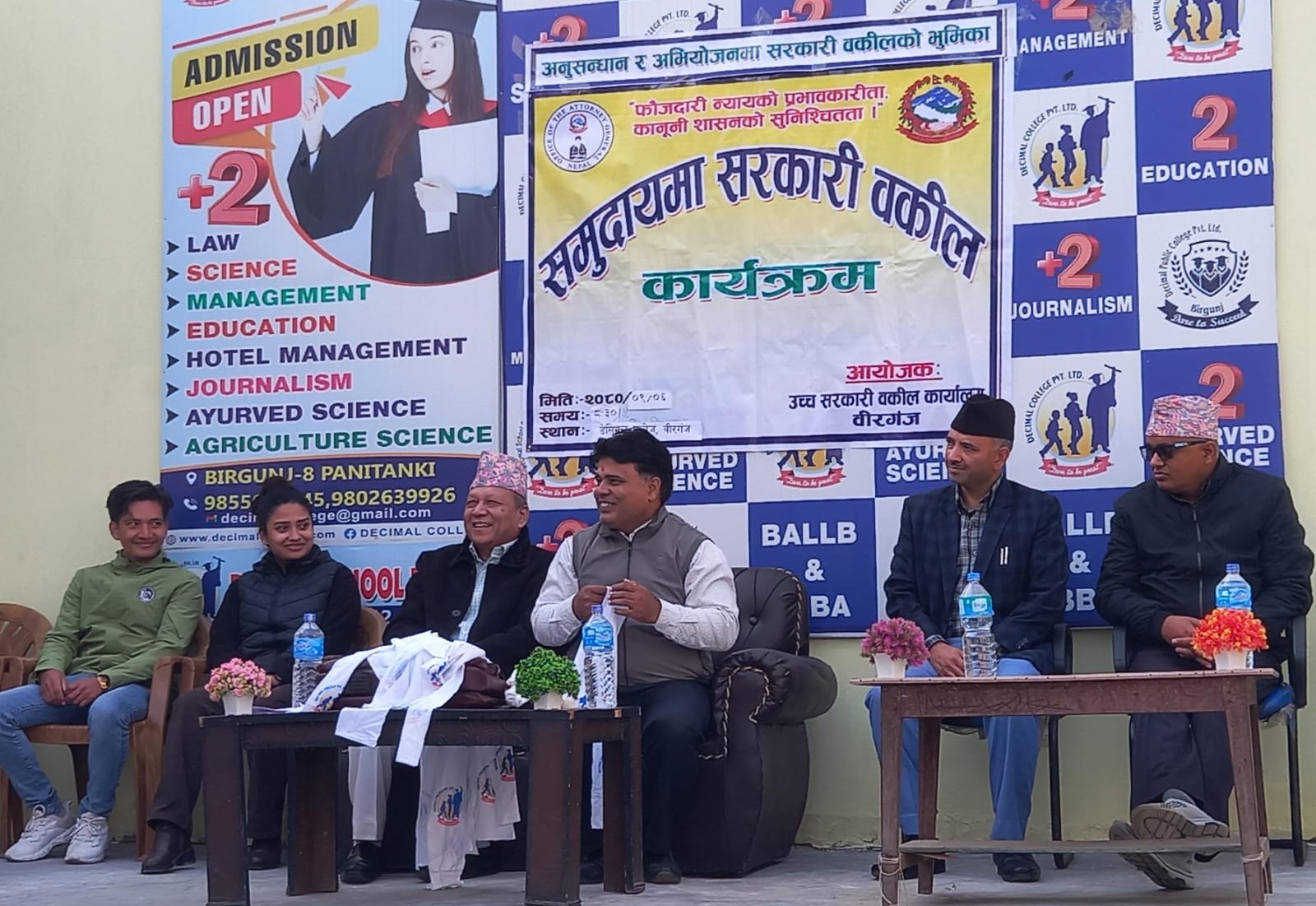 डेसिमल स्कूल वीरगंजका अध्यक्ष सन्नी दुबेकाे प्रमुख आतिथ्यतामा भएकाे कार्यक्रममा डेसिमल स्कूल वीरगंज +२ कानुन संकायका शिक्षक तथा विद्यार्थीहरूको सहभागिता रहेकाे थियाे ।