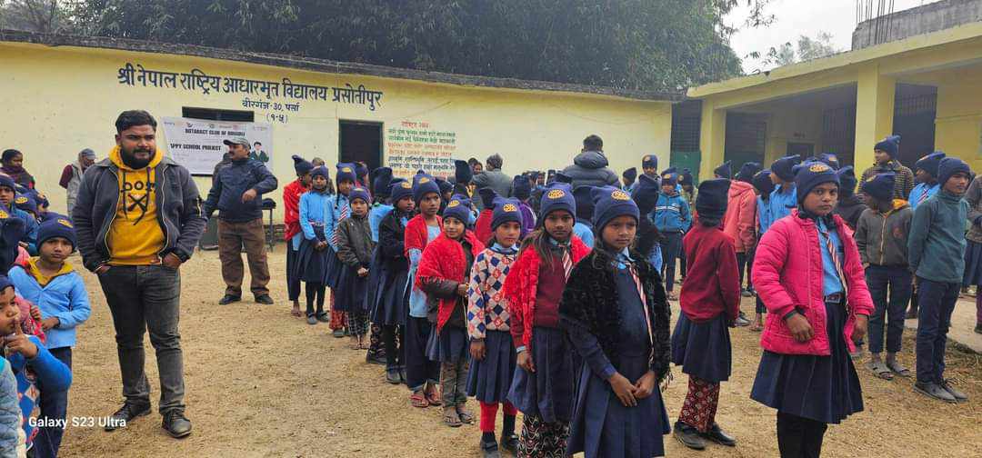 एक कार्यक्रमका बिच रोट्रेक्ट क्लब अफ वीरगंजका अध्यक्ष सन्नी सर्राफले विद्यालयका प्रधानाध्यापक जोगिन्द्र पण्डित कुमाललाई विद्यार्थीहरुको लागि २५० वटा न्यानो टोपी हस्तान्तरण गरेका हुन् । चिसाेलाई मध्यनजर गर्दै विद्यार्थीहरुकाे लागि विद्यालयलाई टाेपी हस्तान्तरण गरिएकाे अध्यक्ष सर्राफले वताए ।