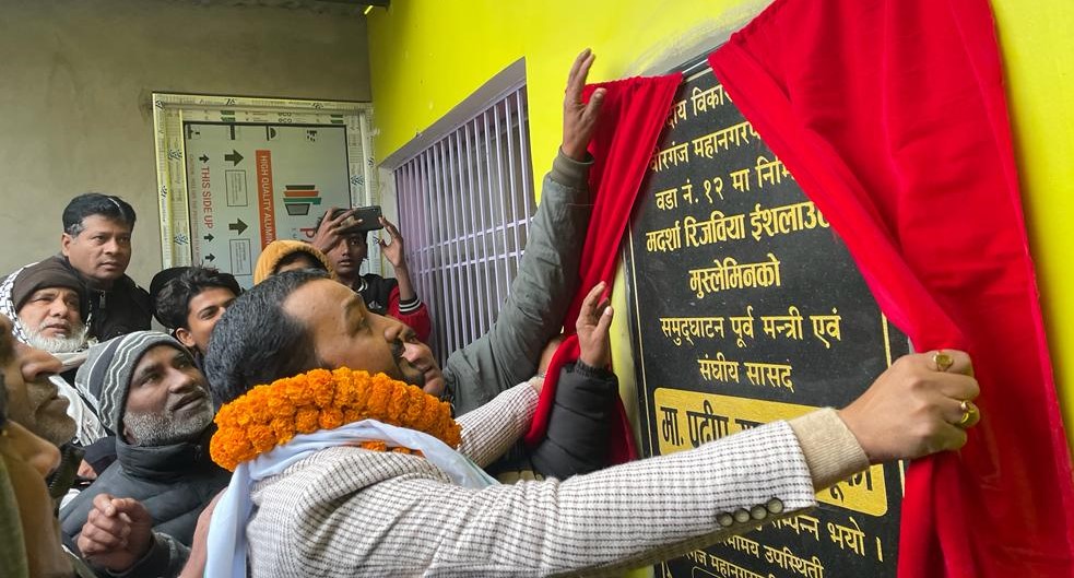 वीरगंज । बीरगंज महानगरपालिकाको वडा नं.१२ मुर्ली नयाँ टोलमा रहेको नवनिर्मित मदर्सा भवनको पूर्वमन्त्री प्रदिप यादवले एक कार्यक्रमका बिच उद्घाटन गरेको छन् । नव निर्मित मदर्सा रिजविया ईशलाउल मुस्लेमिनको भवनको पर्सा निर्वाचन क्षेत्र १ का संघिय सांसद समेत रहेका पूर्वमन्त्री यादवले रिवन काटेर शनिवार उद्घाटन गरेका हुन् भने भवनको मुल गेटमा निर्माण गरिएको सिलालेखको समेत आवरण गरेका हुन् ।