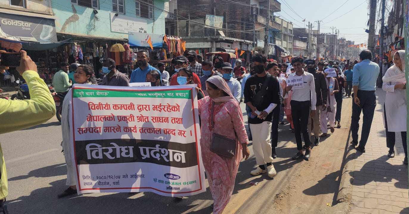 वीरगंज । चुरे तथा वन जंगल संरक्षण अभियानले नेपालमा चीनकाे हस्तक्षेप बढेकाे भन्दै आइचबार वीरगंजमा विराेध प्रदर्शन गरेको छ । चिनियाँ कम्पनीले विकासको नाममा मधेसको लाईफ लाईन मानिने सिरहा र सप्तरी जिल्लाको महेन्द्र राजमार्ग बनाउने बहानामा चुरे पहाडको विनाश गर्दै आईरहेको भन्दै अभियानले विरोध प्रदर्शन गरेको हो ।