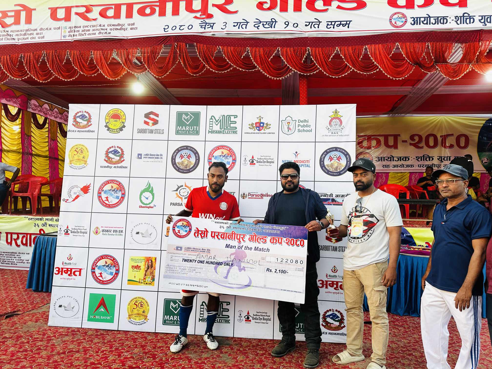 साेमबारकाे खेलमा वीरगंज युनाइटेड क्लब, वीरगंजका जर्सी नम्बर ११ का खेलाडी अमर डन्गोलले म्यान अफ दि म्याच घोषित भए । उनलाई परवानीपुर निवासी युवा प्रदीप सरार्फले नगद २१ सय सहित शिल्ड प्रदान गरे । अगामी चैत १० गते चल्ने प्रतियोगितामा आयोजक शक्ति युवा क्लब, वीरगंज युनाइटेड एफसी, हनामी भरतपुर फुटबल क्लब चितवन, वीरगंजज युथ एकेडेमी, हेटौंडा फुटबल एकेडेमी मकवानपुर, नव जन जागृती युवा क्लब सिमरा ,चिडिया दह स्टार क्लब रौतहट र बाग्मती फुटबल क्लब सर्लाही सहभागी हुनेछन ।