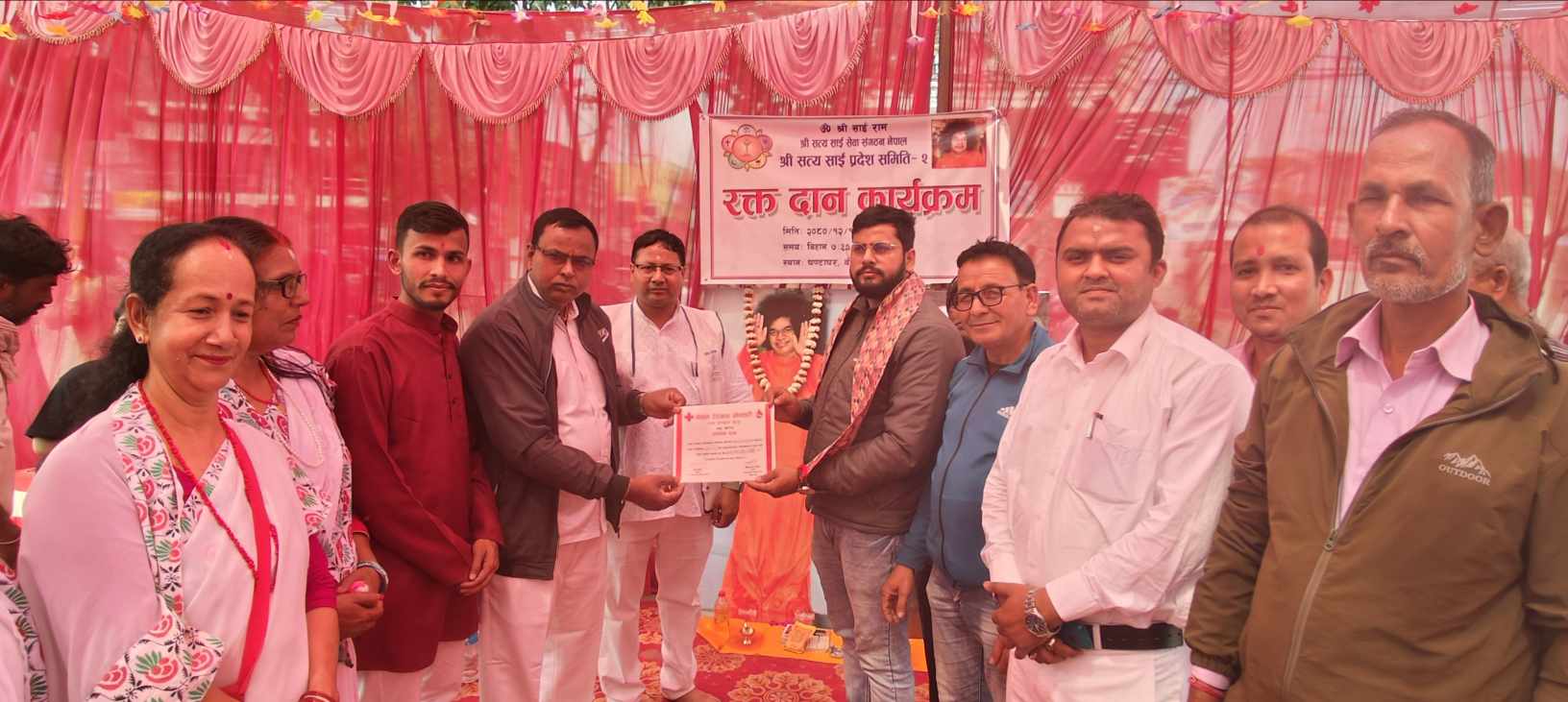 श्री सत्य साई मधेश प्रदेश समितिका अध्यक्ष जीवन चाैरसियाकाे अध्यक्षतामा भएकाे कार्यक्रममा सिमितका सदस्य चन्देश्वर चाैरसिया, रविभुषण चाैरसिया, राजिन्द्र प्रसाद लगायतकाे उपस्थिती रहेकाे थियाे । रक्त संचार केन्द्र वीरगंजकाे प्राविधिक सहयाेगमा कार्यक्रम भएकाे थियाे ।