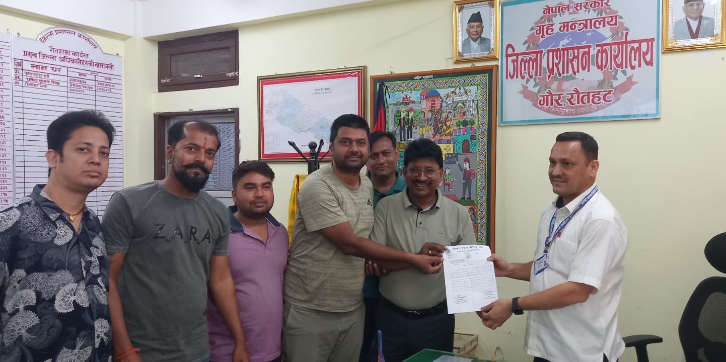 ज्ञापन पत्र मार्फत रौतहटकाे सदरमुकाम गौरमा रहेका मदिरा पसल तथा होटल व्यवसायलाई ८ बजे सम्म खुला राख्ने प्रावधानलाई परिवर्तन गर्दै १०.३० बजे सम्म खुला राख्नुपर्ने माग गरिएको छ ।