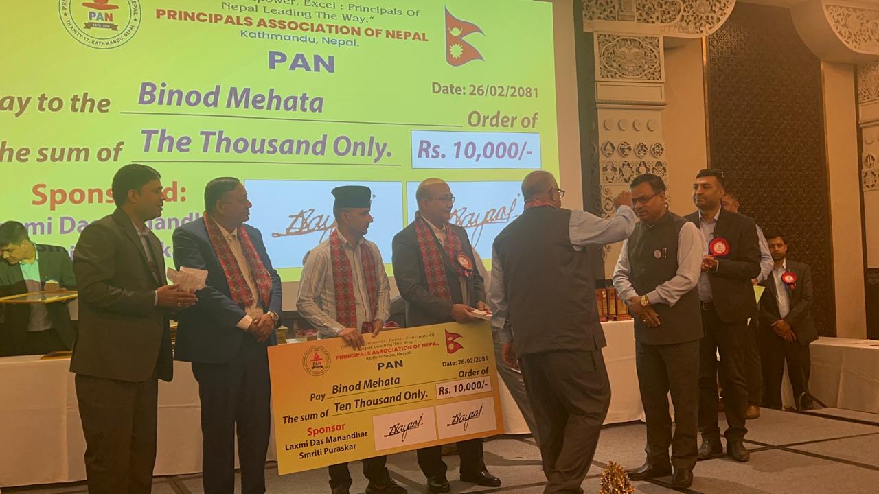 “प्रिन्सिपलस एशोसिएसन अफ नेपाल” (पान) ले काठमाण्डौको लाजिम्पाटमा आयोजना गरेको देशैभरका सामुदायीक विद्यालयहरुको प्रधानाध्यापकहरुकाे प्रथम राष्ट्रिय सम्मेलनमा प्राधानाध्यापक मेहता नगद पुरस्कार सहित सम्मान गरेकाे हाे ।