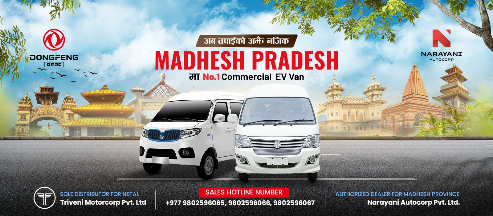 वीरगंज । मधेश प्रदेशको अधिकारिक बिक्रेता नारायणी अटोकर्प प्रा.ली.ले डोंगफेंग इलेक्ट्रिक (ईभी) भ्यानको अग्रिम बुकिङ खुलाएको छ । मधेश प्रदेशको जुनसुकै शहरबाट बूकींग गर्न सकिने बारे नारायणी अटोकर्पका सञ्चालक रजत बजाजले बताए ।