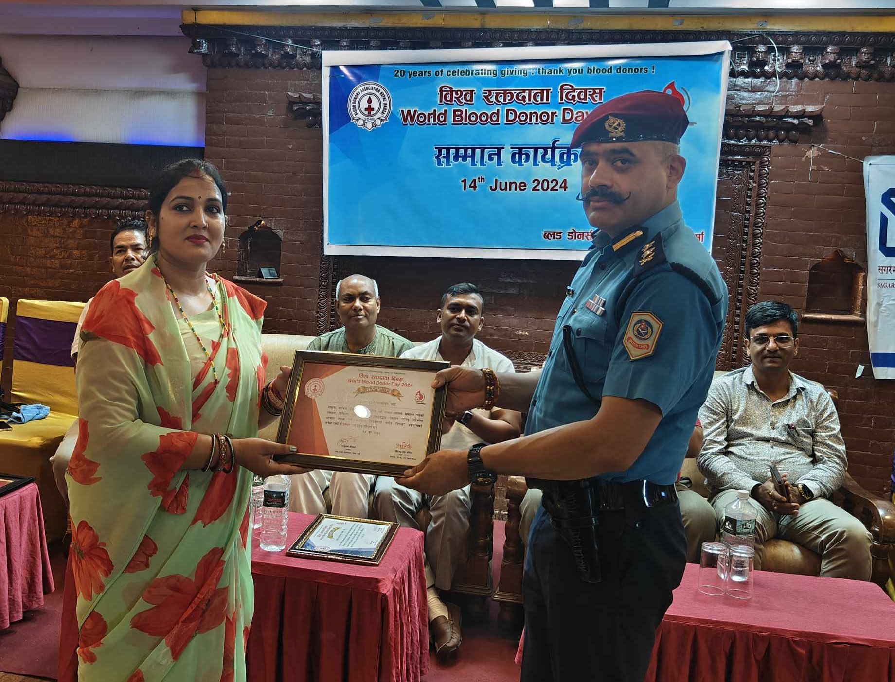 ब्लड डोनर्स एशोसिएसन पर्सा शाखाले आयोजना गरेको कार्यक्रममा प्रमुख अतिथि नेपाल रेडक्रस सोसाईटी पर्सा शाखाका सभापति विरेन्द्रराज कडेल सहितका बिशिष्ट अतिथीहरुले सम्मानित संस्था र व्यक्तिहरूलाई सम्मान गरेका हुन् ।