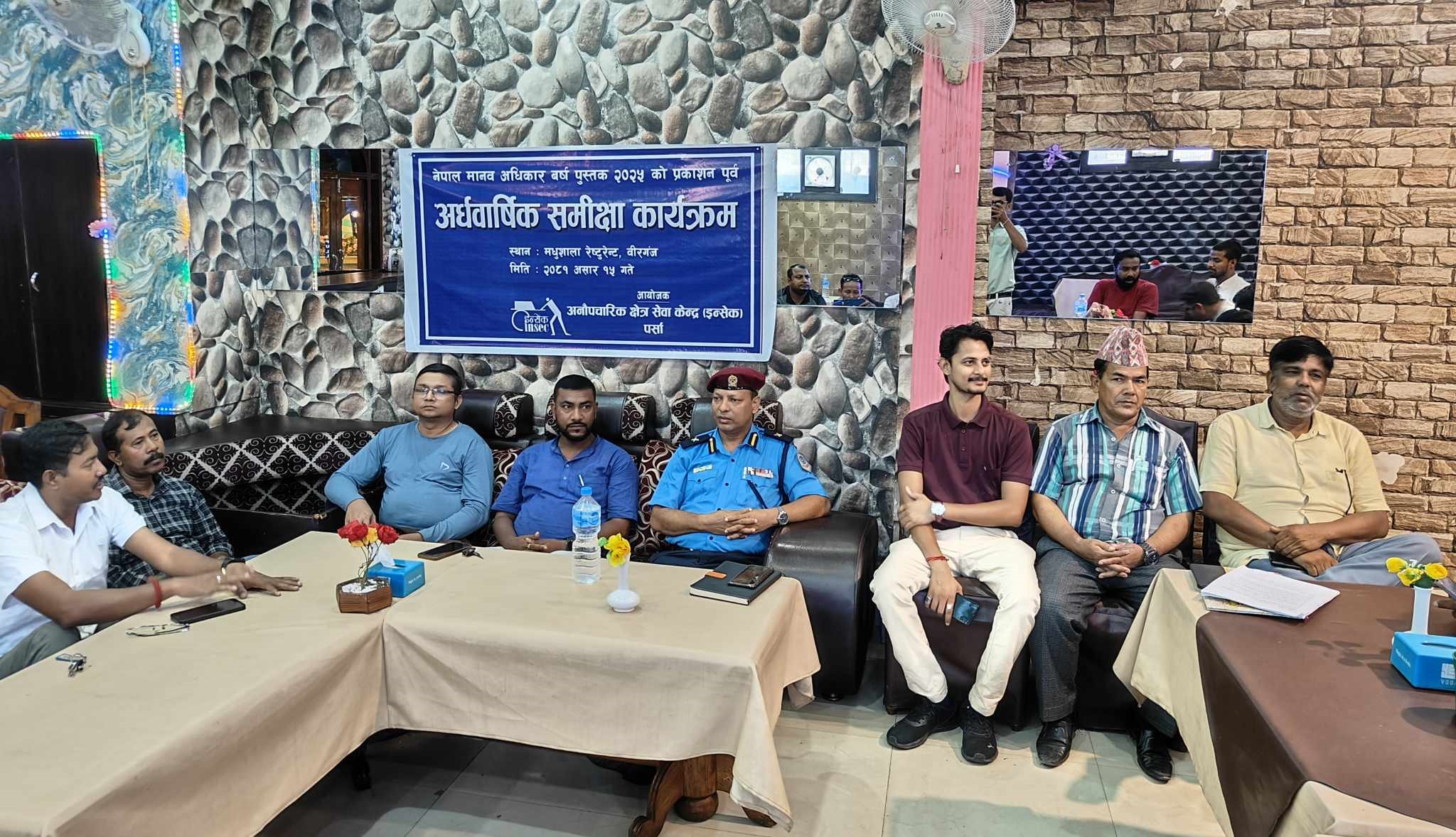 वीरगंज । नेपाल मानव अधिकार वर्ष पुस्तक २०२५ प्रकाशन पूर्व शनिवार वीरगंजमा अर्धवार्षिक समिक्षा कार्यक्रम सम्पन्न भएको छ । अनौपचारिक क्षेत्र सेवा केन्द्र (इन्सेक) पर्साको आयोजनामा भएको कार्यक्रममा सहभागीहरुले जिल्लामा मानवअकिार उल्लंघनको घटना अभिलेखमा जिल्ला प्रहरी कार्यालय पर्साले बेवास्ता गरेको गुनासो गरेका हुन् ।
