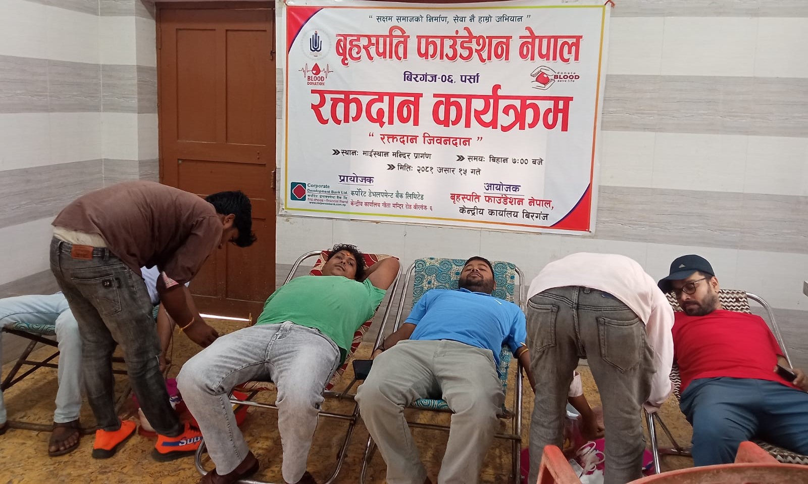यसैगरी बृहस्पति फाउन्डेसन नेपालद्वारा आयोजित कार्यक्रममा ४ महिला सहित २९ जनाले रक्तदान गरेका छन् । वीरगंजकाे माइस्थानमा भएकाे कार्यक्रममा स्वस्तिका चाैधरी, धिरज गुप्ता, रिसु पटेल, राहुल बर्णवाल, विजय साह, सुजिता राउत, अमाेद प्रसाद गुप्ता लगायतले रक्तदान गरेका हुन् ।