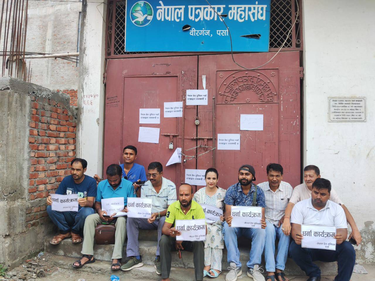प्रेस युनिनयन पर्साले सोमबार वीरगंजस्थित नेपाल पत्रकार महासंघ पर्सा शाखाको कार्यालय अगाडि धर्ना दिएको हो । प्रेस युनियन पर्साका अध्यक्ष विजय महतोको नेतृत्वमा युनियनमा आबद्ध पत्रकारहरुले पत्रकार महासंघको कार्यालय अगाडि बिहान ११ बजेदेखि दिउँसो १ बजेसम्म धर्ना दिएका हुन् । प्रेस युनियनको केन्द्रिय कार्य समितिको निर्देशन अनुसार पर्सामापनि दुई घण्टा धर्ना दिइएको प्रेस युनियन पर्साका अध्यक्ष महतोले बताए ।