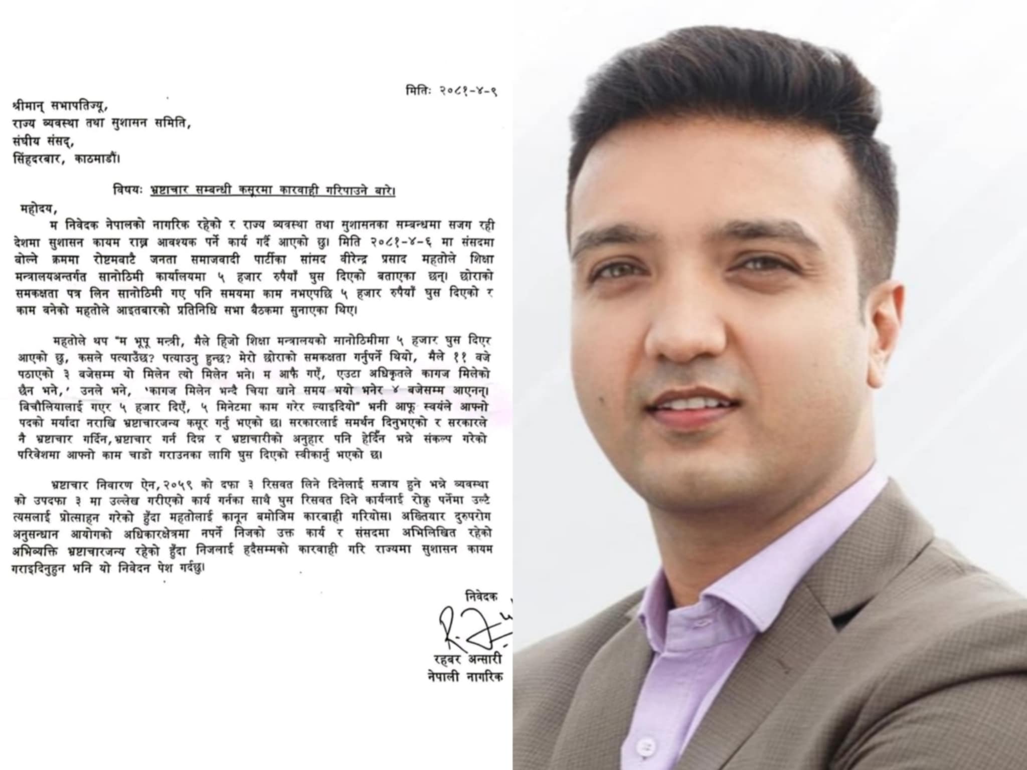 वीरगंज । मधेश प्रदेशका प्रदेश सभा सदस्य रहबर अन्सारीले जनता समाजवादी पार्टीका सांसद वीरेन्द्र प्रसाद महतोलाई कारबाही गर्न माग गरेका छन् । छोराको समकक्षता पत्र लिँदा शिक्षा मन्त्रालय अन्तर्गतको सानोठिमीस्थित कार्यालयलाई बिचौलिया मार्फत पाँच हजार रुपैयाँ घुस दिएको बताएका सांसद महतोलाई कारबाही गर्न माग गर्दै अन्सारीले प्रतिनिधि सभाको राज्य व्यवस्था तथा सुशासन समितिमा उजुरी दिएका छन् ।