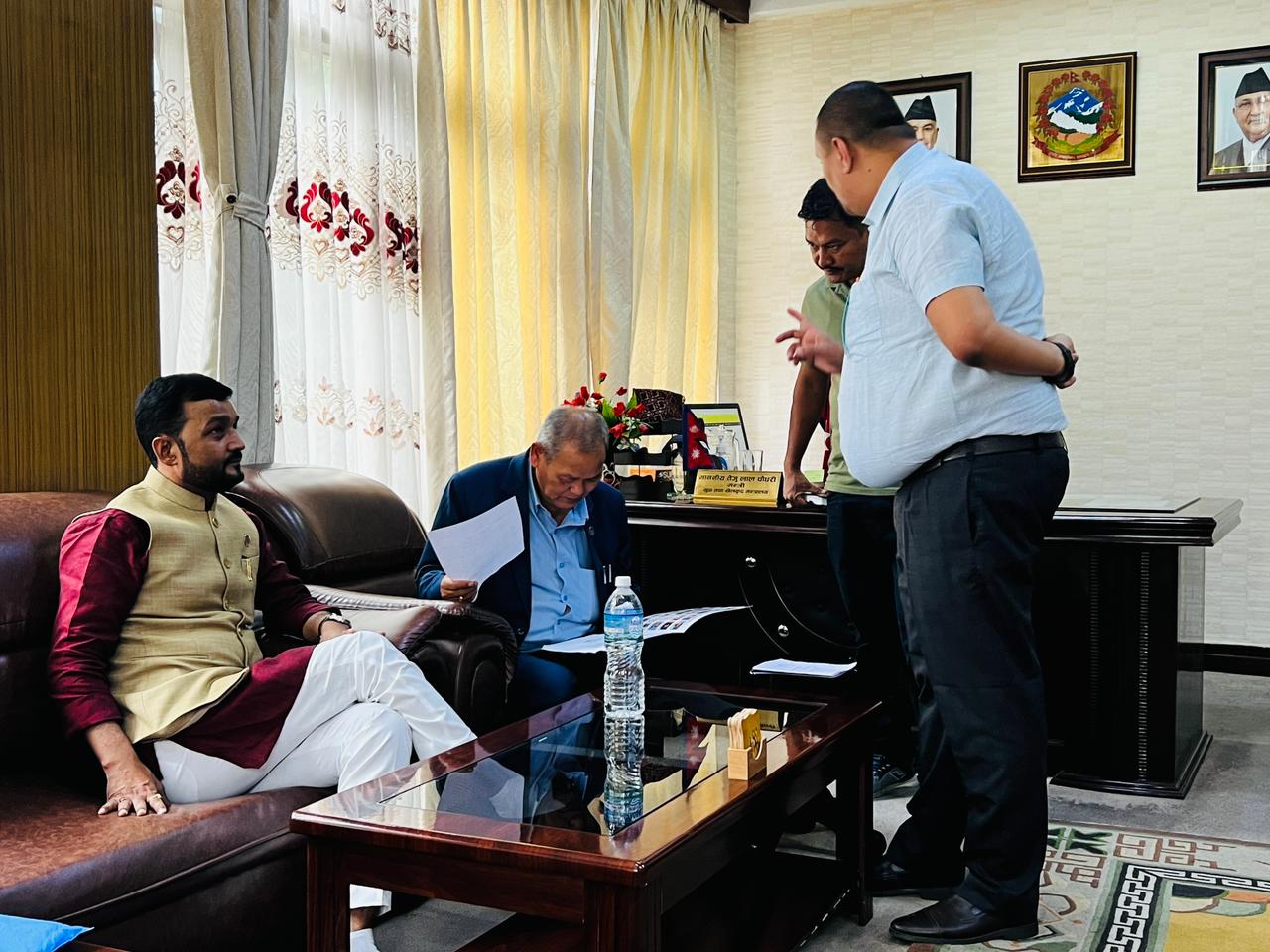 वीरगंज । नेपाल सरकारका खानेपानी मन्त्री प्रदीप यादवले मंगलबार युवा तथा खेलकुद मन्त्री तेजु लाल चौधरीसँग भेट गर्दै गृह नगर वीरगंजस्थित नारायणी रङ्गशालाको जीर्णोद्धार र पुनर्निर्माणका लागि आवश्यक बजेटको व्यवस्थापन गर्न आग्रह गरेका छन् ।