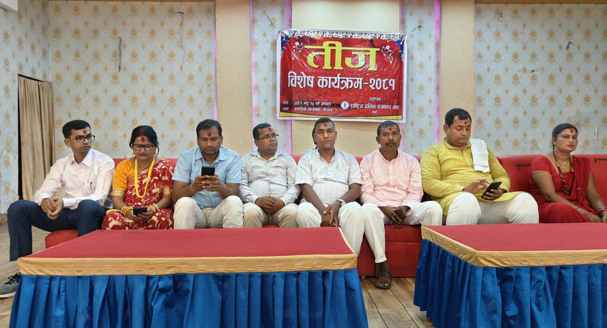 वीरगंज । राष्ट्रिय दलित पत्रकार संघ पर्साको आयोजनामा शनिबार वीरगंजमा तिज बेशेष कार्यक्रम सम्पन्न भएको छ । वीरगंजस्थित कलाशिक ब्याँकेटमा भएकाे कार्यक्रमका तिज पर्वकाे शुभकामना अदानप्रदान समेत गरिएकाे थियाे ।
