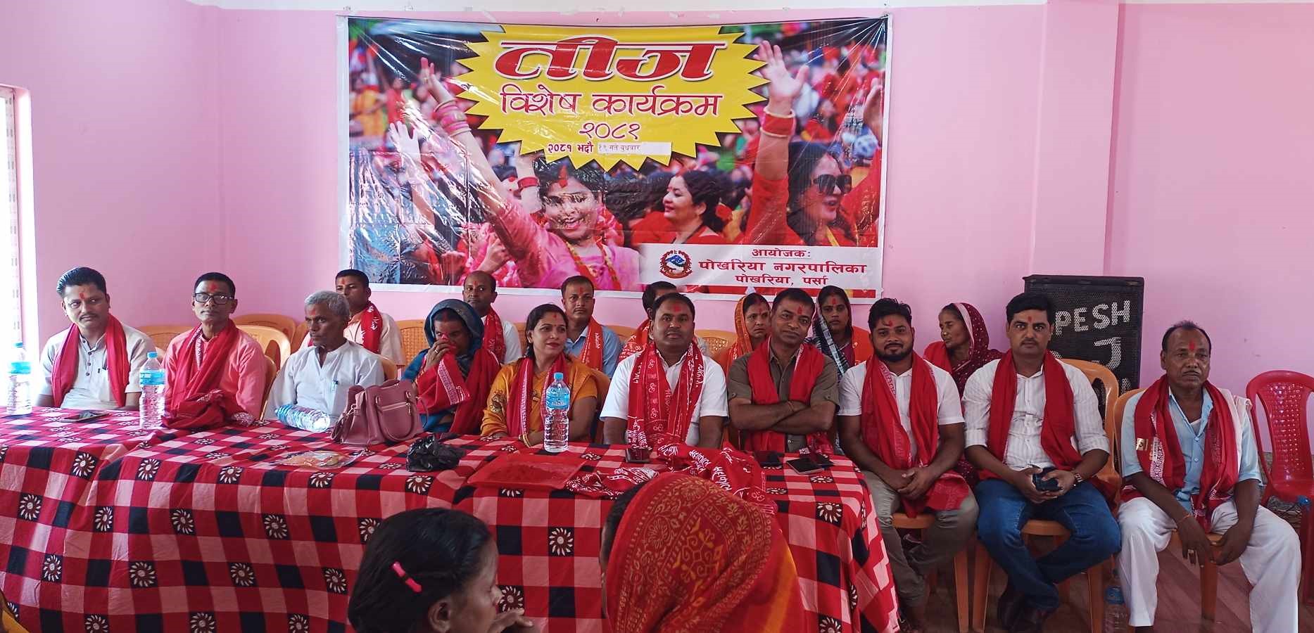 पाेखरिया । पर्साकाे पोखरिया नगरपालिकाकाे आयोजनामा बुधबार तीज विशेष कार्यक्रम सम्पन्न भएकाे छ। पोखरिया नगरपालिकाकाे वडा नम्बर ४ का वडाध्यक्ष लक्ष्मण साह कानको अध्यक्षतामा भएकाे कार्यक्रमकाे उद्घाटन पोखरिया नगरपालिकाकी उप प्रमुख रूबी कुमारी ठाकुरले गरेकी थिइन ।