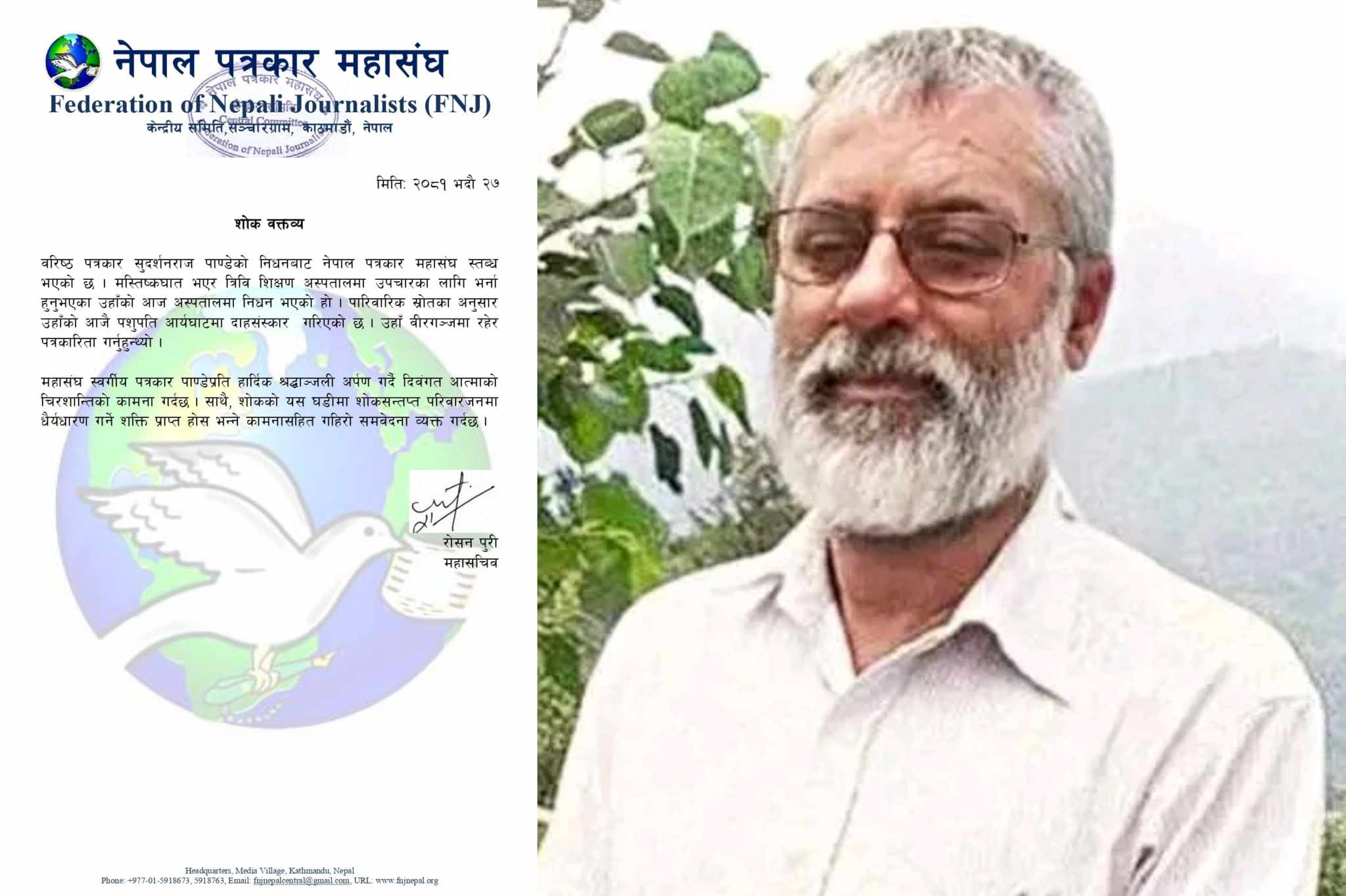 वीरगंज । वीरगंजका बरिष्ठ पत्रकार सुदर्शनराज पाण्डेको निधन भएको छ । काठमाण्डौको महाराजगंज स्थित शिक्षण अस्पतालको सघन उपचारकक्षमा भेन्टिलेटरमा राखेर उपचार भइरहेको अवस्थामा उनको बिहिवार अपरान्ह निधन भएको नेपाल पत्रकार महासघ मधेश प्रदेशका महासचिव श्याम बन्जाराले जानकारी दिए ।