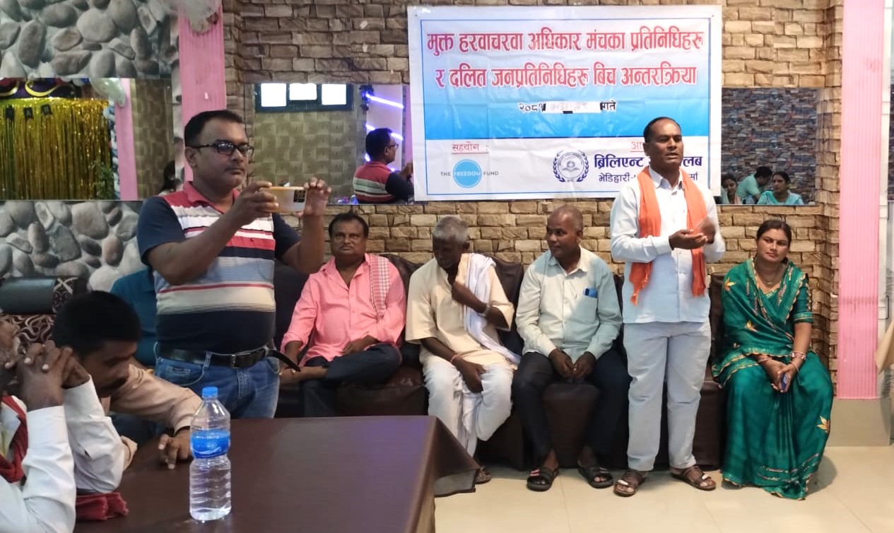 द फ्रिडम फण्डकाे सहयाेग र ब्रिलिएन्ट युवा क्लबकाे आयाेजनामा भएकाे कार्यक्रमममा दलित जनप्रतिधिहरुसंग मंचका प्रतिनिधिहरुले मुक्त हारवाचरवाहरुकाे न्यायिक मांगलाई सम्बाेधन गराउन महानगरपालिकासंग पहल गरिदिन अनुराेध गरेका थिए ।