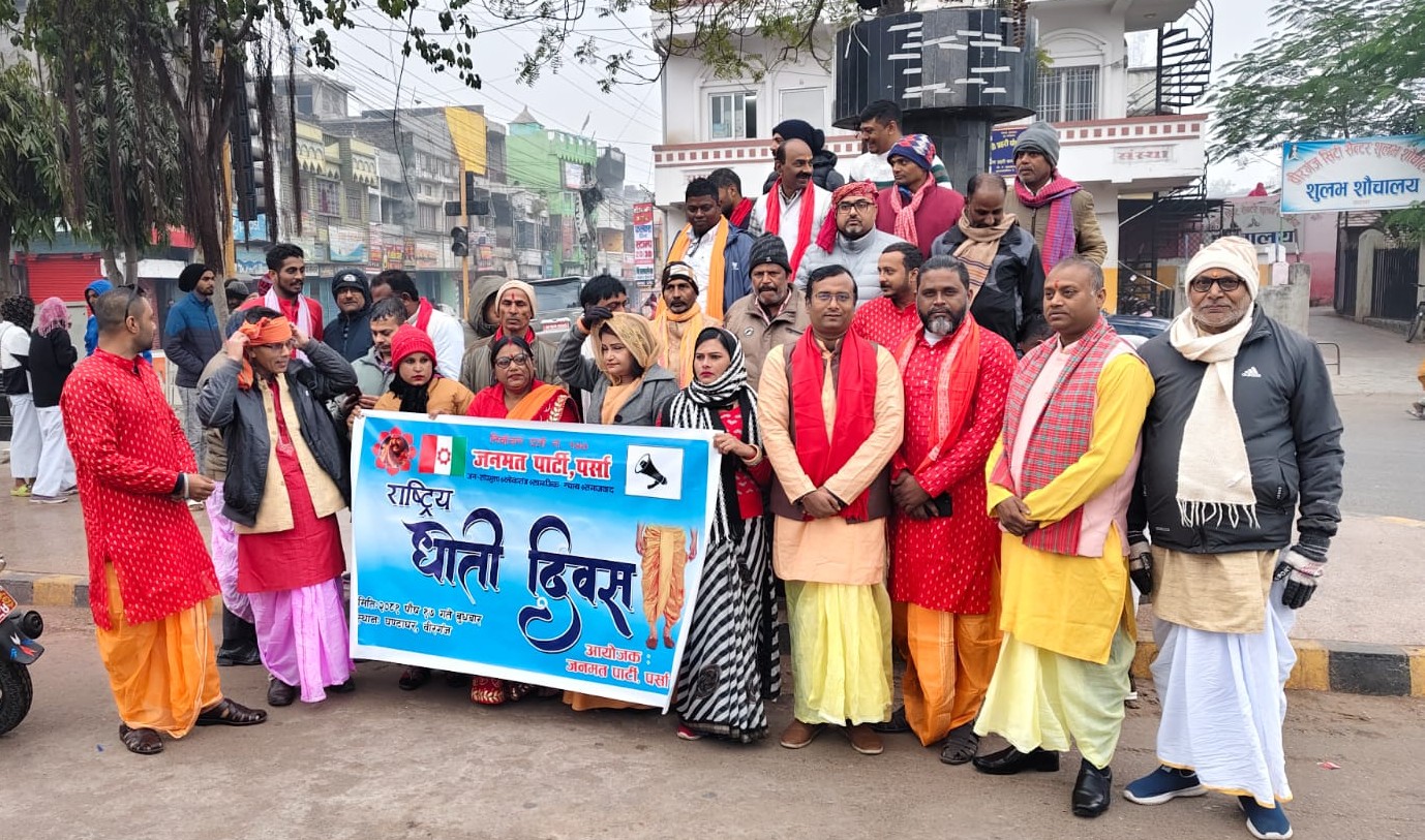 वीरगंज । जनमत पार्टी पर्साले पनि बुधबार वीरगंजमा राष्ट्रिय धोती दिवस मनाइएको छ । डा. सिके राउत नेतृत्वको जनमत पार्टीका नेता कार्यकर्ताले अंग्रेजी नयाँ वर्षको दिन बुधबार वीरगंजमा राष्ट्रिय धोती दिवस मनाएका हुन् ।