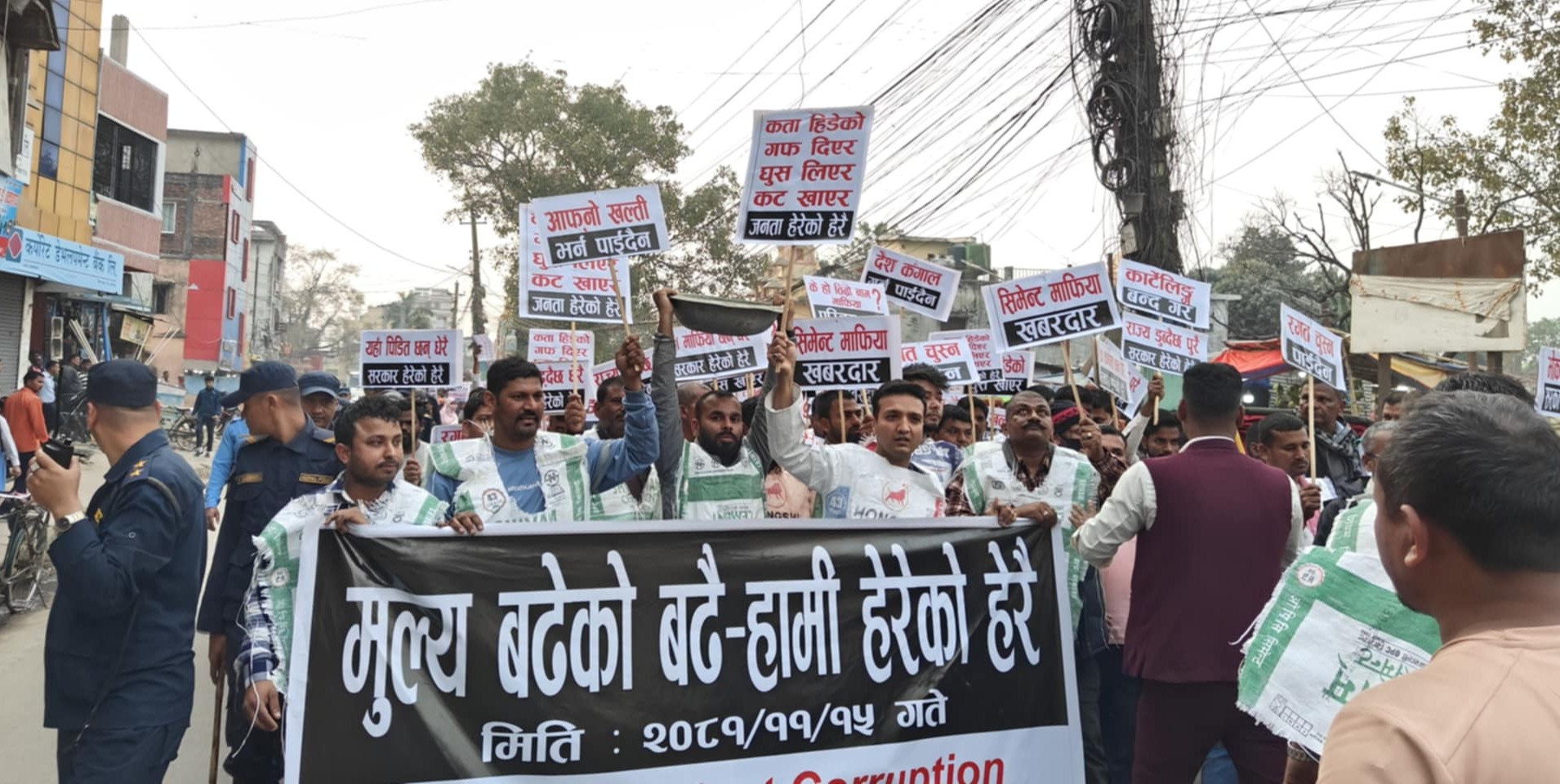 वीरगंज । सिमेन्ट उद्योगको कार्टेलविरुद्ध बिहिबार वीरगंजमा प्रदर्शन भएकाे छ । सर्वोच्च अदालतमा सिमेन्ट उद्योगको कार्टेलविरुद्ध रिट दायर समेत गरेका नेकपा माओवादी केन्द्रका नेता एवं प्रदेश सभा सदस्य रहबर अन्सारीकाे नेतृत्वमा सिमेन्टको चर्को मूल्यको विरुद्धमा पृथक शैलीमा प्रदर्शन भएकाे हाे ।