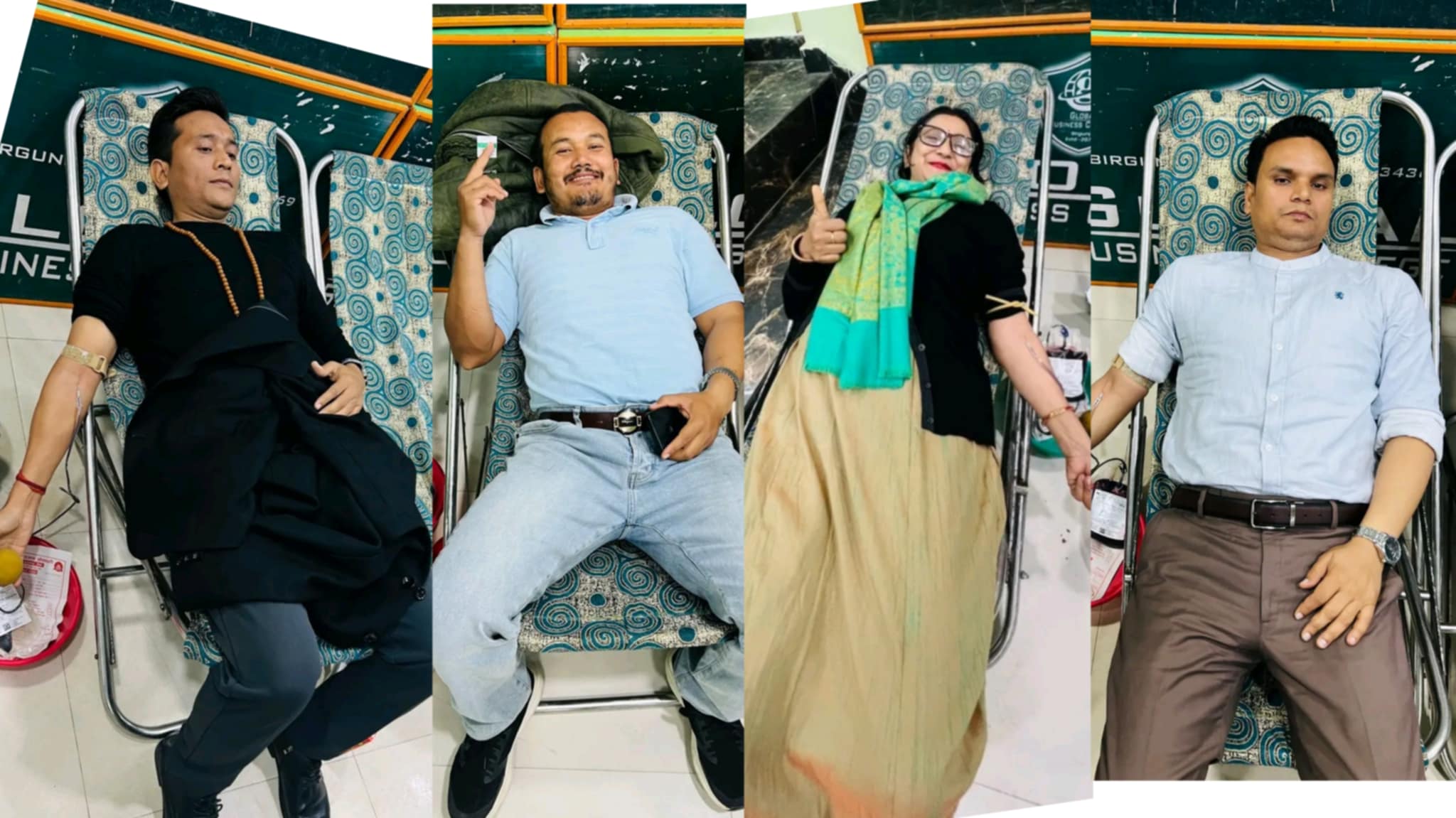 यसैगरी पुजा पटेल, दिपेेश सर्राफ, रबिन्द्र गुप्ता, मुस्कान चाैधरी, प्रकाश सिंह, प्रिन्स पटेल, विशाल चाैरसिया, शनिक कुमार साह, आयुष पटेल, राेहित साह, राेशन सिंह राजपुत, खुशी कुमारी यादव, लक्ष्मी श्रेष्ठ, अंकित कुमार गुप्ता, उज्वल कुमार दास, राजु राैनियार, सागर गुप्ता, मन्दिप भण्डारी, मनिष कुमार साह, शतिस कुमार कुशवाहा, संदिप साह, संजित साह, अजय कुमार कुर्मी लगाएतकाले रक्तदान गरेकाे रक्त संचार केन्द्र वीरगंजले जनाएकाे छ ।