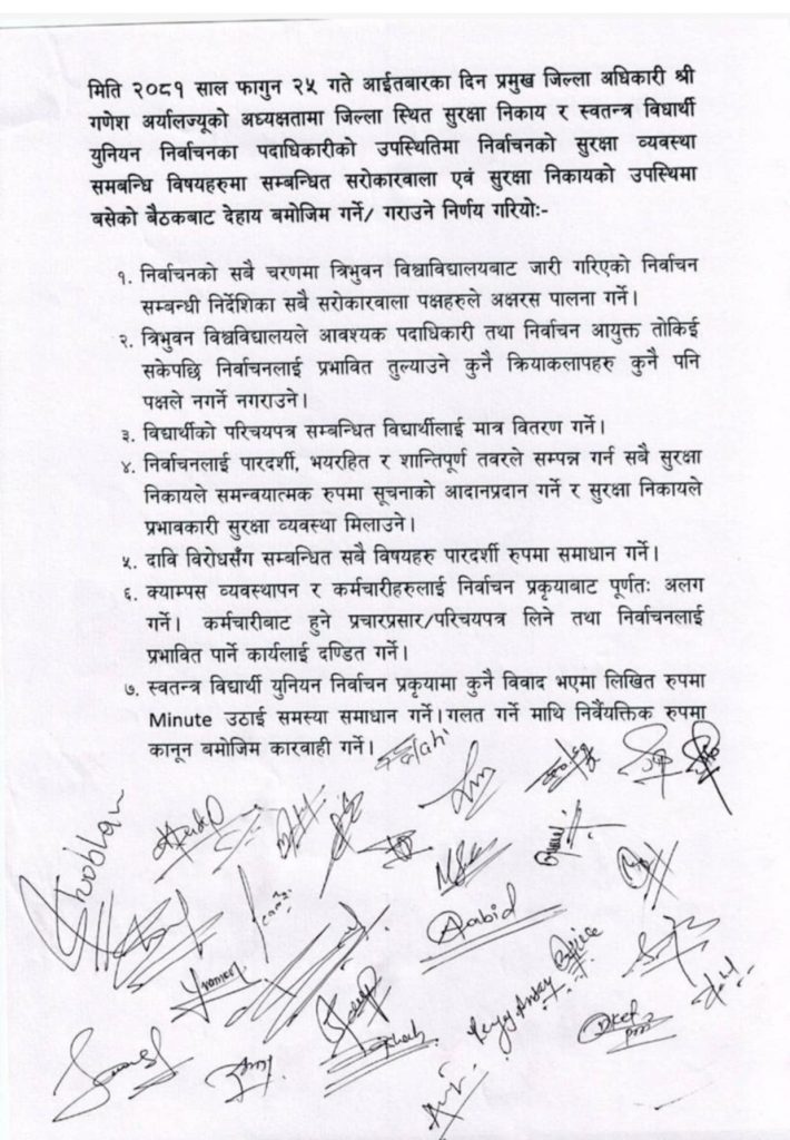 यसैगरी बैठकले विद्यार्थीको परिचयपत्र सम्बन्धित विद्यार्थीलाई मात्र वितरण गर्ने, निर्वाचनलाई पारदर्शी, भयरहित र शान्तिपूर्ण तवरले सम्पन्न गर्न सबै सुरक्षा निकायले समन्वयात्मक रुपमा सूचनाको आदानप्रदान गर्ने र सुरक्षा निकायले प्रभावकारी सुरक्षा व्यवस्था मिलाउने, दावि विरोधसँग सम्बन्धित सबै विषयहरु पारदर्शी रुपमा समाधान गर्ने, क्याम्पस व्यवस्थापन र कर्मचारीहरुलाई निर्वाचन प्रकृयाबाट पूर्णतः अलग गर्ने पनि निर्णय गरेकाे छ ।