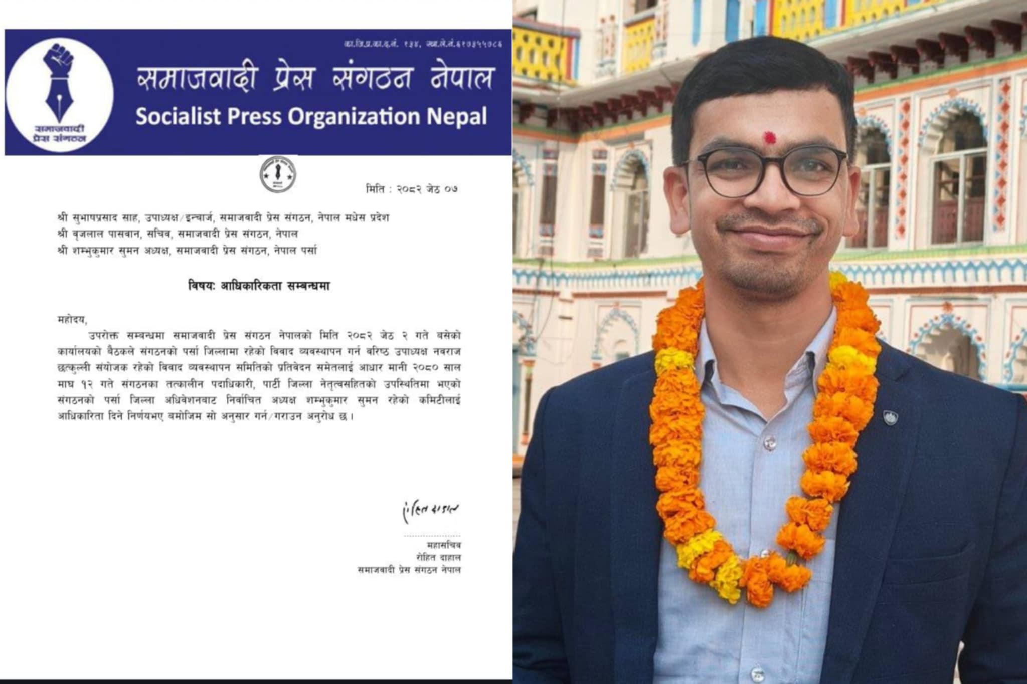 समाजवादी प्रेस संगठन नेपालको मिति २०८२ जेठ २ गते बसेको कार्यालयको बैठकले अध्यक्ष सुमन नेतृत्वको समिति नै आधिकारिक रहेको निर्णय गरेको हो । संगठनका केन्द्रिय अध्यक्ष शम्भु श्रेष्ठको अध्यक्षतामा बसेको बैठकले संगठनको पर्सा जिल्लामा रहेको विवाद व्यवस्थापन गर्न वरिष्ठ उपाध्यक्ष नवराज छत्कुल्ली संयोजक रहेको विवाद व्यवस्थापन समिति बनाएको थियो ।