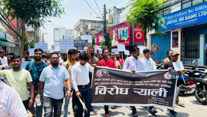 वीरगंज । चालू आर्थिक वर्षदेखि सुनचाँदीका गरगहनामा नयाँ मूल्य अभिवृद्धि कर (भ्याट) लागू गरेपछि पर्सा जिल्लाका सुनचाँदी व्यवसायीहरू आन्दोलित बनेका छन्। भ्याटको नयाँ संरचनाले उपभोक्ता र व्यवसाय दुवैलाई आर्थिक रूपमा नोक्सान पुर्याउने भन्दै उनीहरूले शनिबार वीरगञ्जको घण्टाघर चोकमा विरोध प्रदर्शन गरेका हुन्।