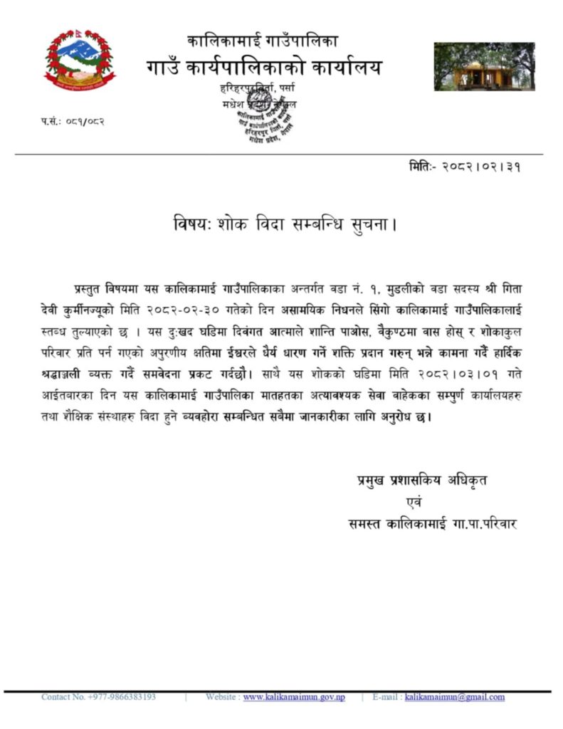 उनले शनिबार एक सूचना जारी गर्दै कालिकामाई गाउँपालिकाको समस्त कार्यालय तथा मातहतका सेवा प्रदायक संस्थाहरूमा आइतबार एक दिन शोक विदा दिइएको जनाएका छन् ।