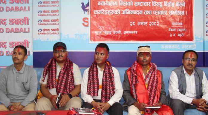 शनिबार राजधानीमा आयोजित पत्रकार सम्मेलनमार्फत पार्टीले कार्यकर्ताहरू अभिनाश कुँवर, पदम मगर र गर्भू महतोलाई सम्मान तथा अभिनन्दन गरेको हो। ती कार्यकर्ताहरूले जेठ २९ गते उच्च अदालतका अस्थायी इजलास वीरगंजका न्यायाधीशद्वय खुसीराम थारु र अर्जुन महर्जनको कार्यकक्षमा पुगेर कालोमोसो छ्यापेका थिए।